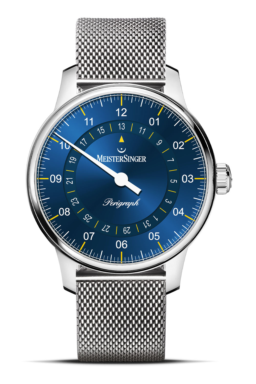 What matters for these limited editions are the dials. Their base is sunray-brushed medium blue, offering a bright and fresh touch, combined with yellow markers for the hours. This bright colour is also found on the date indicator at 12 o’clock and, as you’ve seen, also on the leather strap closed by a deployant buckle. If you prefer a sportier or more discreet look, MeisterSinger also offers these Perigraph models on steel mesh bracelet or other leather straps.