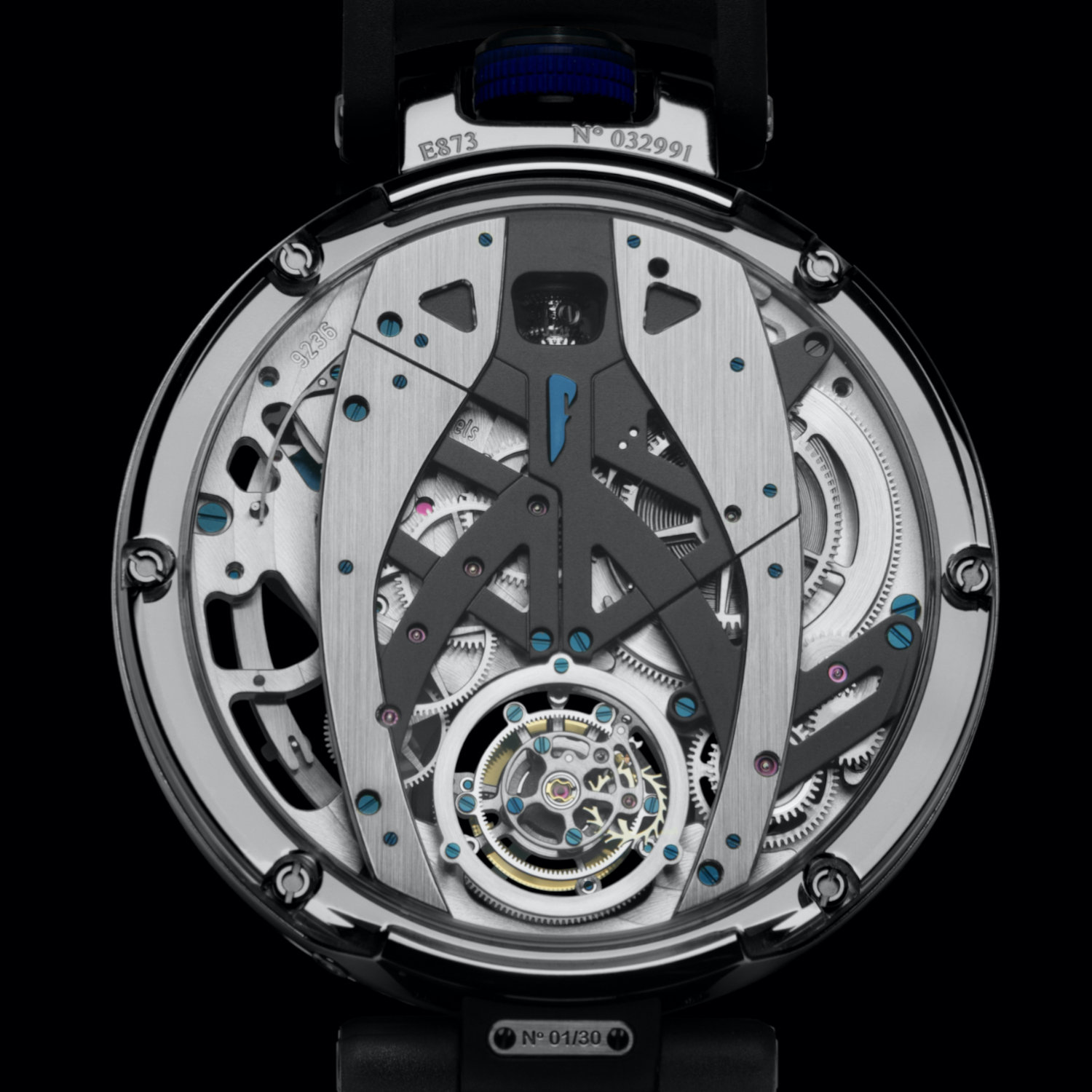 The Bovet Battista Tourbillon has a 45.60mm case made of polished grade 5 titanium, red gold or platinum, sandwiched between two boxed sapphire crystals – but it remains surprisingly thin, at 11.95mm. Underneath the crystal is a dial, or better yet, elements of a dial as almost the entire movement is visible. Asymmetrical central hands, styled after elements of the car, indicate time on a suspended hour track in blue. The hands and indices, as well as the three tips on the tourbillon cage, are accentuated with Super-LumiNova.