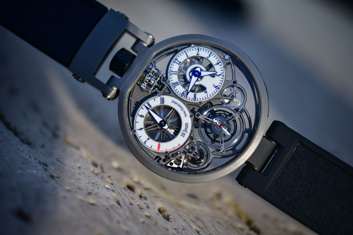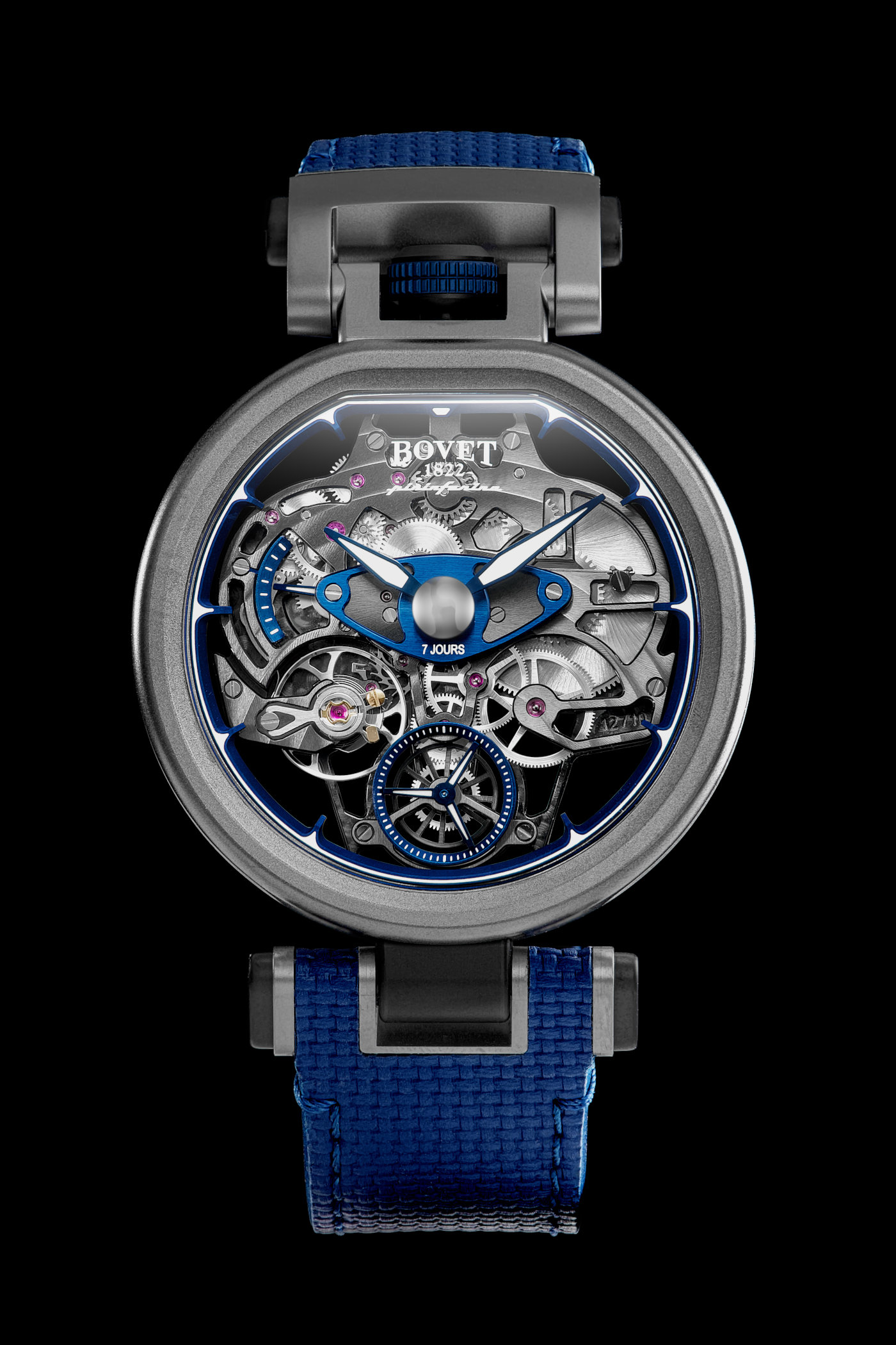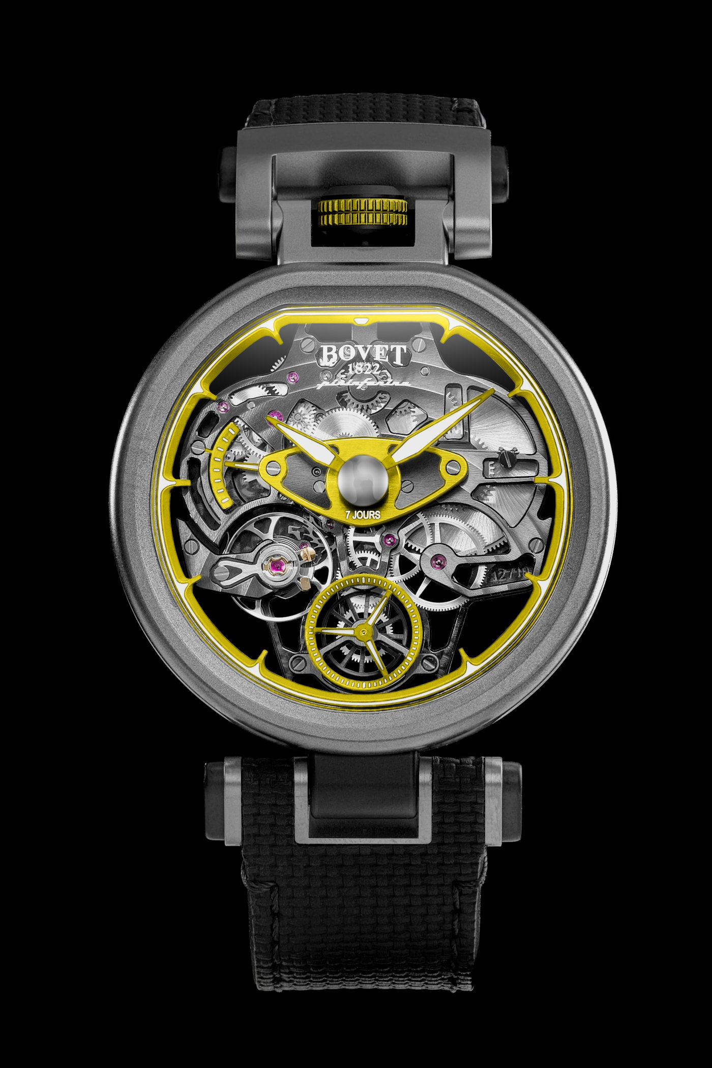 Everything is finished to Haute Horlogerie standards of course and given a PVD or CVD coating depending on the intended final colour. The power reserve is a very impressive 7 days long, or 168 hours if you will. The movement is ‘sandwiched’ between two coloured plates (blue or yellow) sort of resembling something found in a car’s suspension system. Winding and setting are done through the crown at 12′, a typical Bovet trait.