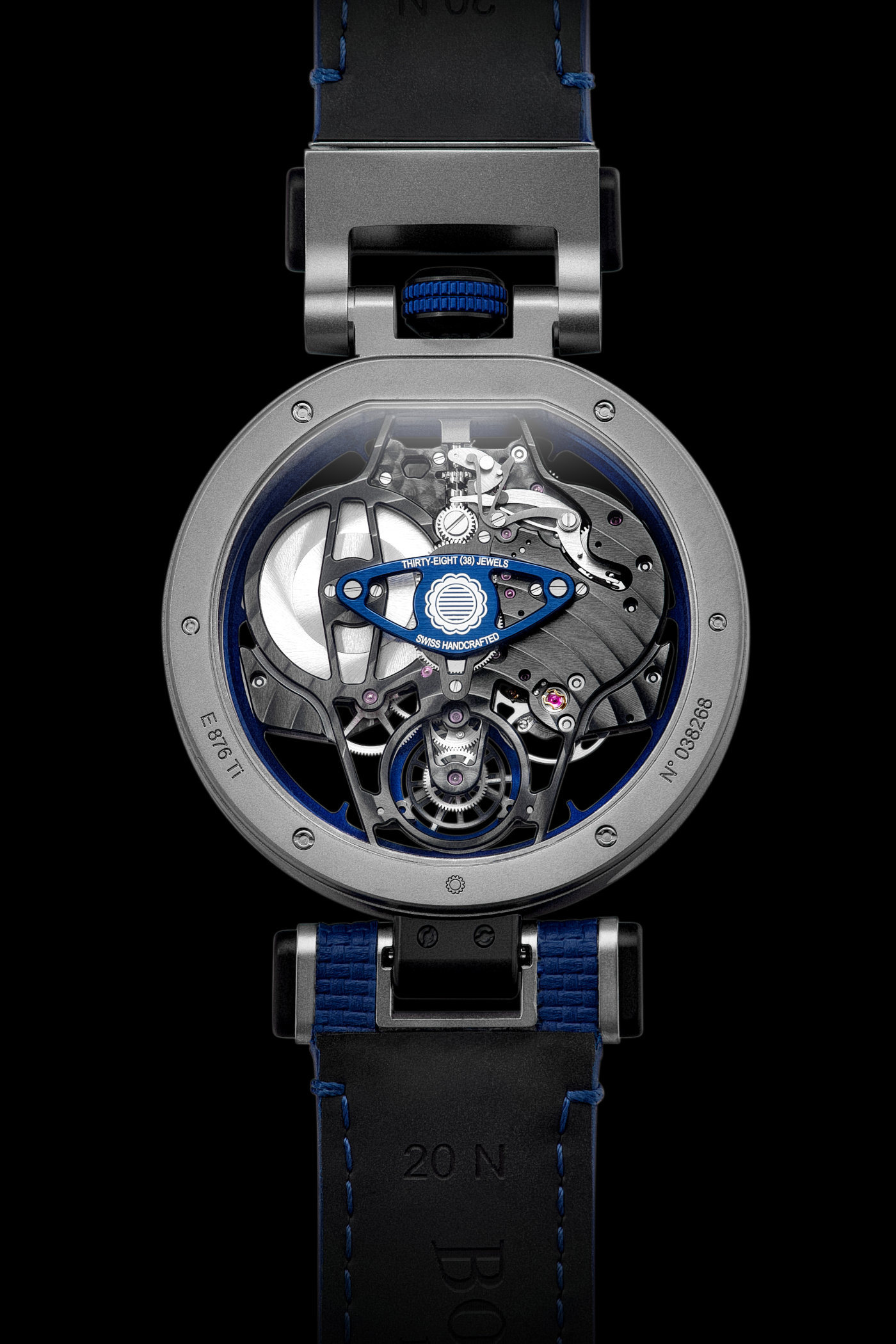 The collaboration between high-end independent watchmaker Bovet and the illustrious Pininfarina design studio (now part of the Mahindra group, which launched Automobili Pininfarina in 2018) started almost a decade and a half ago and has always focused on performance, both technically and aesthetically, such as in the Battista Tourbillon (above, left) and the OttantaSei 10-Day Tourbillon (above, right). That’s why this latest one, the Bovet x Pininfarina Aperto 1 also comes in an ultra-lightweight sandblasted grade 5 titanium case. The sides of the case have been scalloped to remove as much material as possible, and even the movement is as minimalistic as possible in its construction. The case is 42mm in diameter and tops out at 10.95mm in height. A sapphire crystal on the front and back keeps the movement safe, and the black rubber-clad crown is positioned at the top.