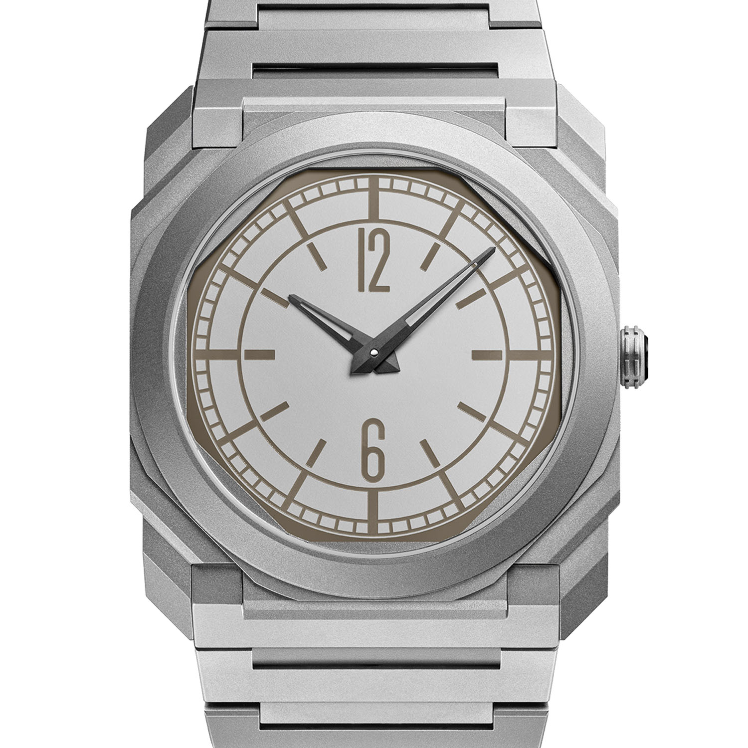 Bulgari reports that a few ideas were exchanged between Aurel Bacs, Senior Consultant, Bacs & Russo and Alexandre Ghotbi, Head of Watches, Continental Europe & Middle East and Fabrizio Buonamassa Stigliani, Product Creation Executive Director, Bulgari Watches. There were suggestions for different materials and dial finishes, “but the slimness of the watch limited our possibilities… and at the same time, it increased the challenge of creating an eye-catching dial.” The dial is indeed quite remarkable, evoking different references. The creators looked to pay homage to great Italian architects and designers of the 20th century, opted for minimalism and simplicity and agreed upon a sector dial design with symmetry around the central axis. By letting the small seconds go, the Bulgari Octo Finissimo Special Edition for Phillips Watches draws all attention to the laser-engraved shapes. The circles in the octagon and the two large numerals 6 and 12 in their positions occupy the sand-blasted titanium dial, and the engravings’ colour changes depending on the lighting.