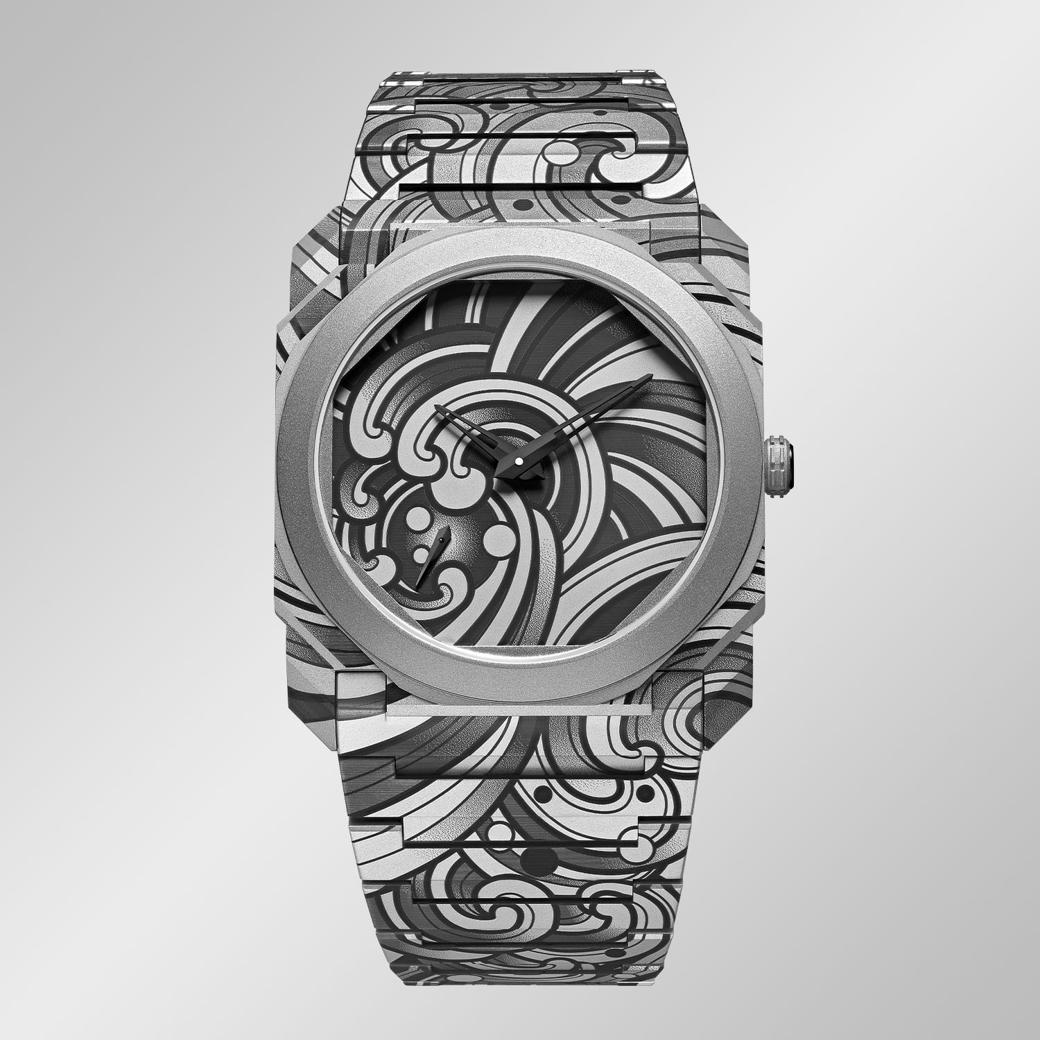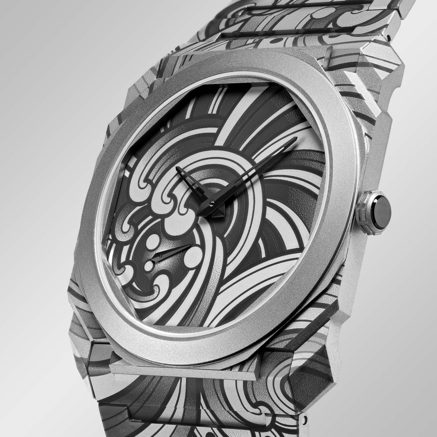 This opus and its predecessor are certainly not the first examples of watch cases and bracelets engraved with a tattoo motif. However, with the Octo Finissimo Tattoo Acqua, the decoration is truly as close to the skin as it can be, “an extension of the wearer’s wrist,” according to Mo Coppoletta.
