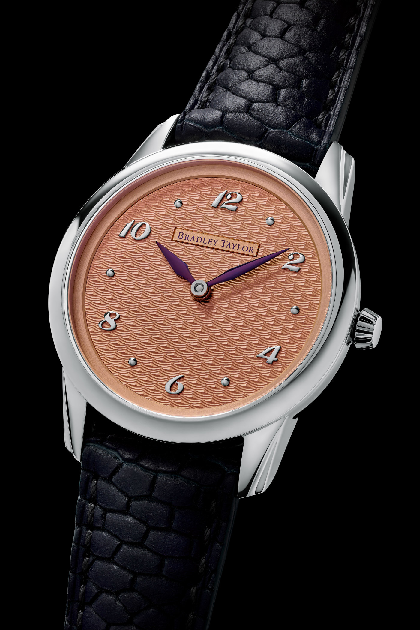 A new set of hands have been crafted for the Lutria, which shows the hours and minutes only. Each is entirely handcrafted and can take between 12 and 20 hours to finish. The hands are constructed with two components, which are polished to perfection before being heat-treated to a deep purple tone. The colour purple is notoriously difficult to achieve even when heat-treating components, as the window in which purple appears and shifts into the eventual and more common blue tones is minimal. The hands are complemented by applied dots and numerals, the latter designed by Canadian typographer Ian Brignell.