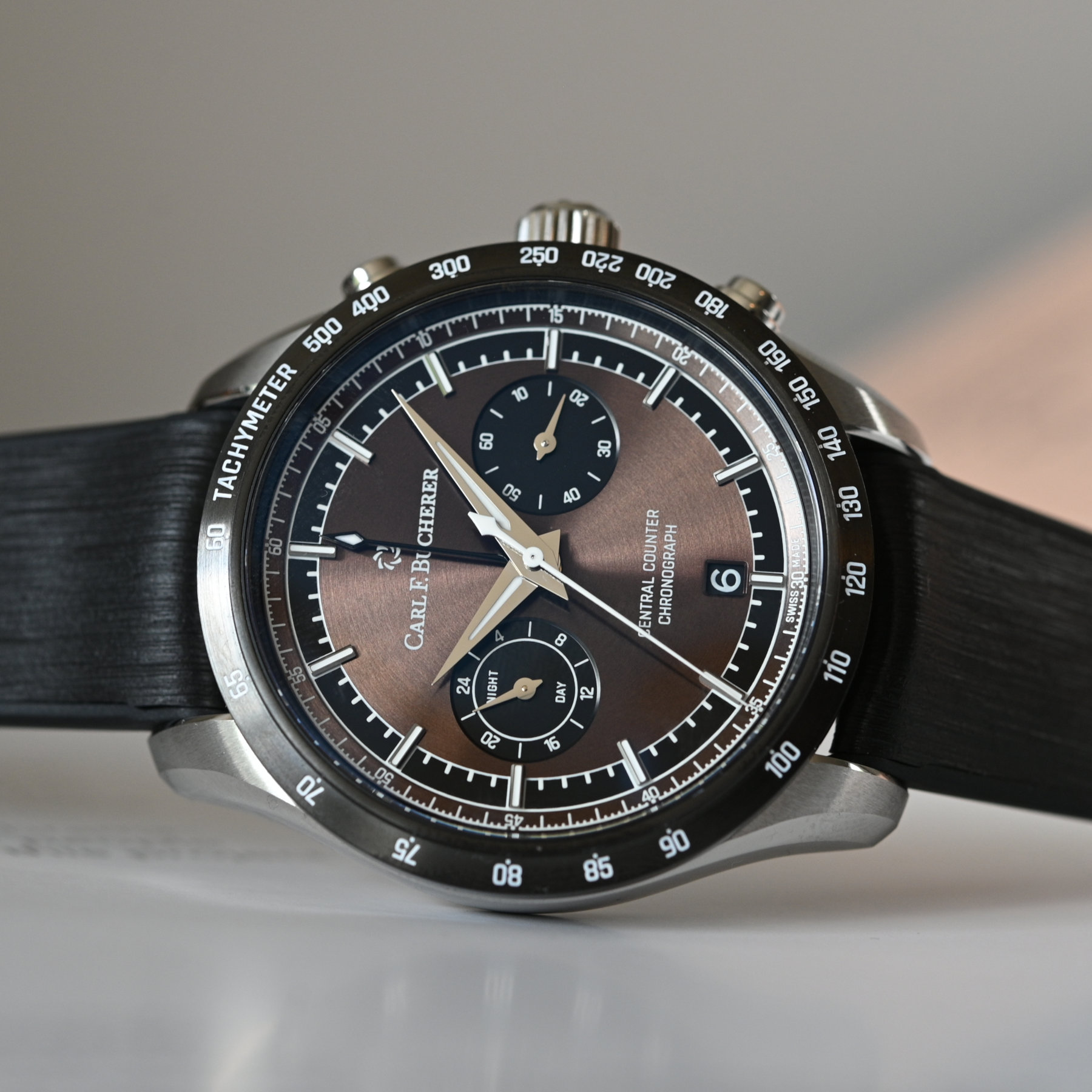 The round stainless steel case of the Manero Central Counter, measuring 42.5mm in diameter and 14.43mm thick, wears comfortably on the wrist, yet exhibits a distinct, utilitarian vibe not commonly found in most other Manero chronographs. The combination of brushed and polished parts creates an eye-catching contrast, while the broader lugs with a polished chamfer lend a touch of rugged elegance. The pushers, designed like low-profile shiny buttons, exude a rough charm, and the glossy pull-out crown adds a subtle hint of sophistication. Adding to the visual allure, the steel tachymeter bezel is coated in polished black diamond-like carbon (also known as DLC and a tougher alternative to PVD), providing a striking contrast against the dial under the domed sapphire crystal.
