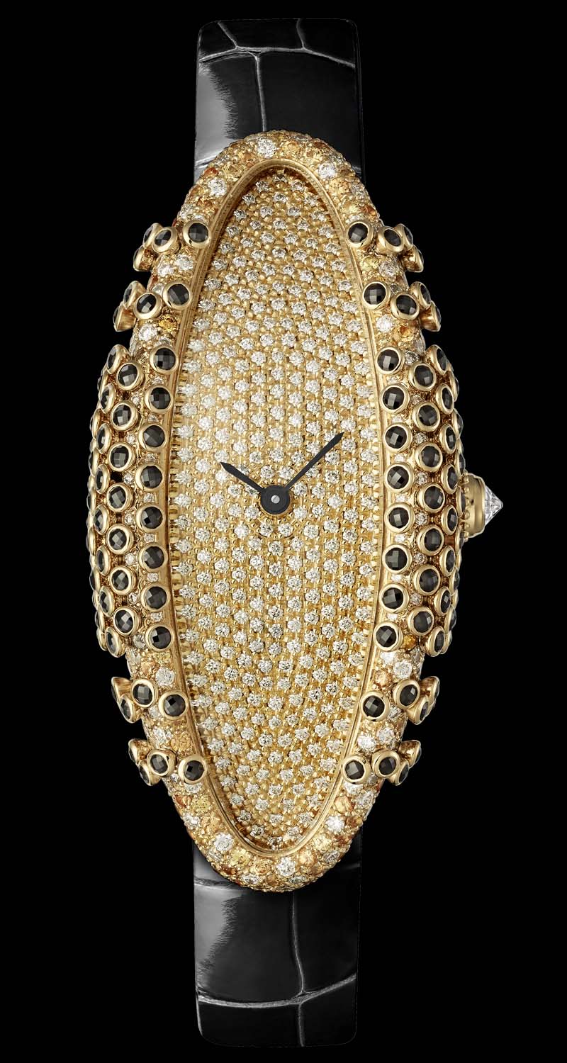Each version of the Cartier Baignoire Allongée will be limited to 50 pieces, with prices ranging from EUR 60,000 for the black/yellow gold model and EUR 70,000 for the Céladon model.