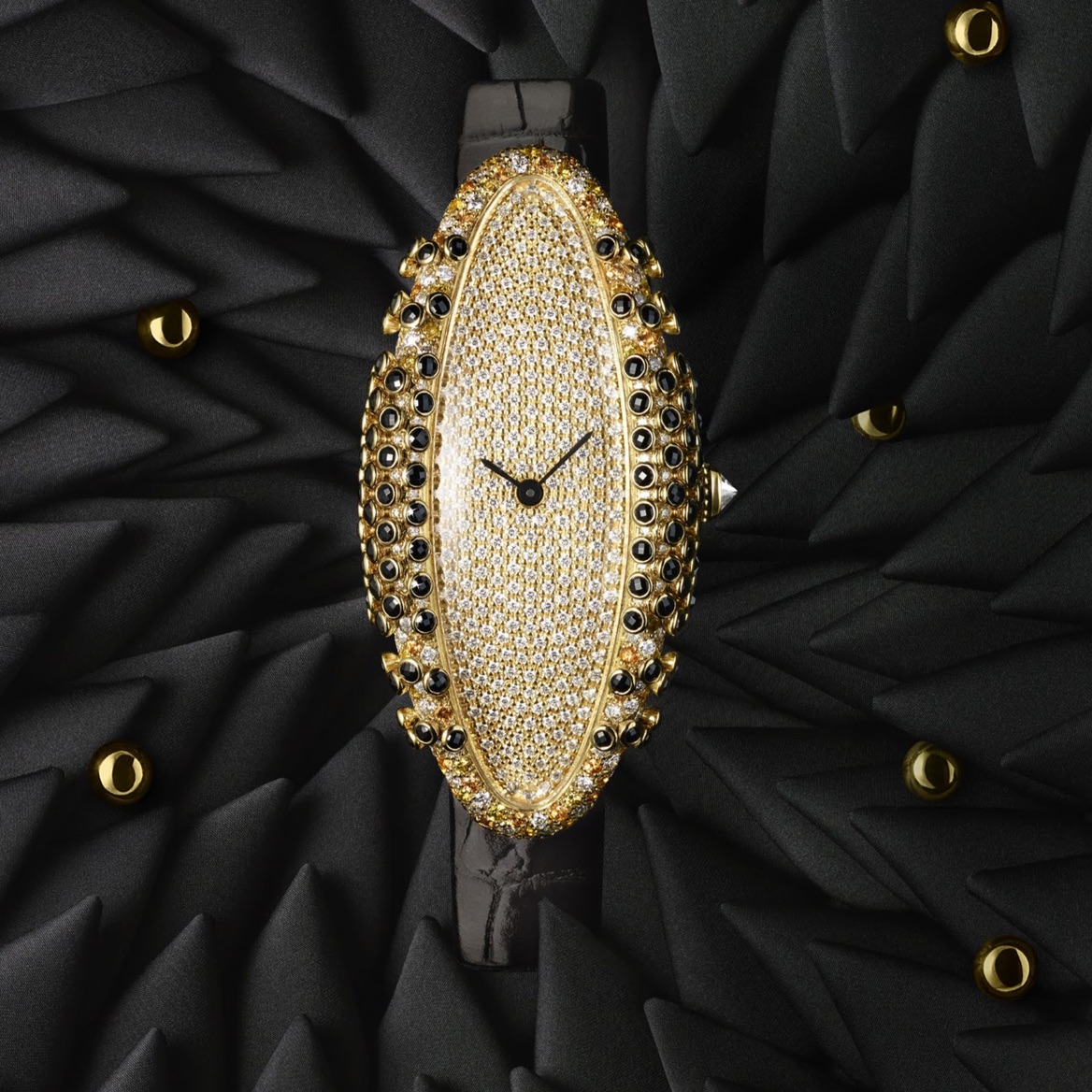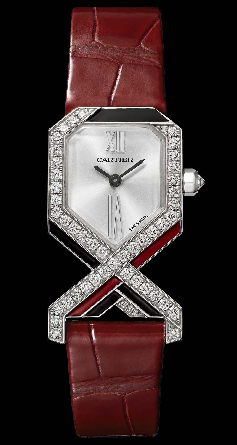 Don’t bother hunting for this watch in Cartier’s archives because it is a new creation. Tapping into the sleek Art Deco aesthetic that has worked so well for the brand, the Diagonale plays with geometric shapes. Jazzy black and red enamel lines enhance its contorted features a flourish of 70 diamonds adds a fine jewellery touch. Like the Tank Chinoise Red, the watch runs on a quartz movement and will be limited to 50 pieces at an expected price of EUR 35,000.