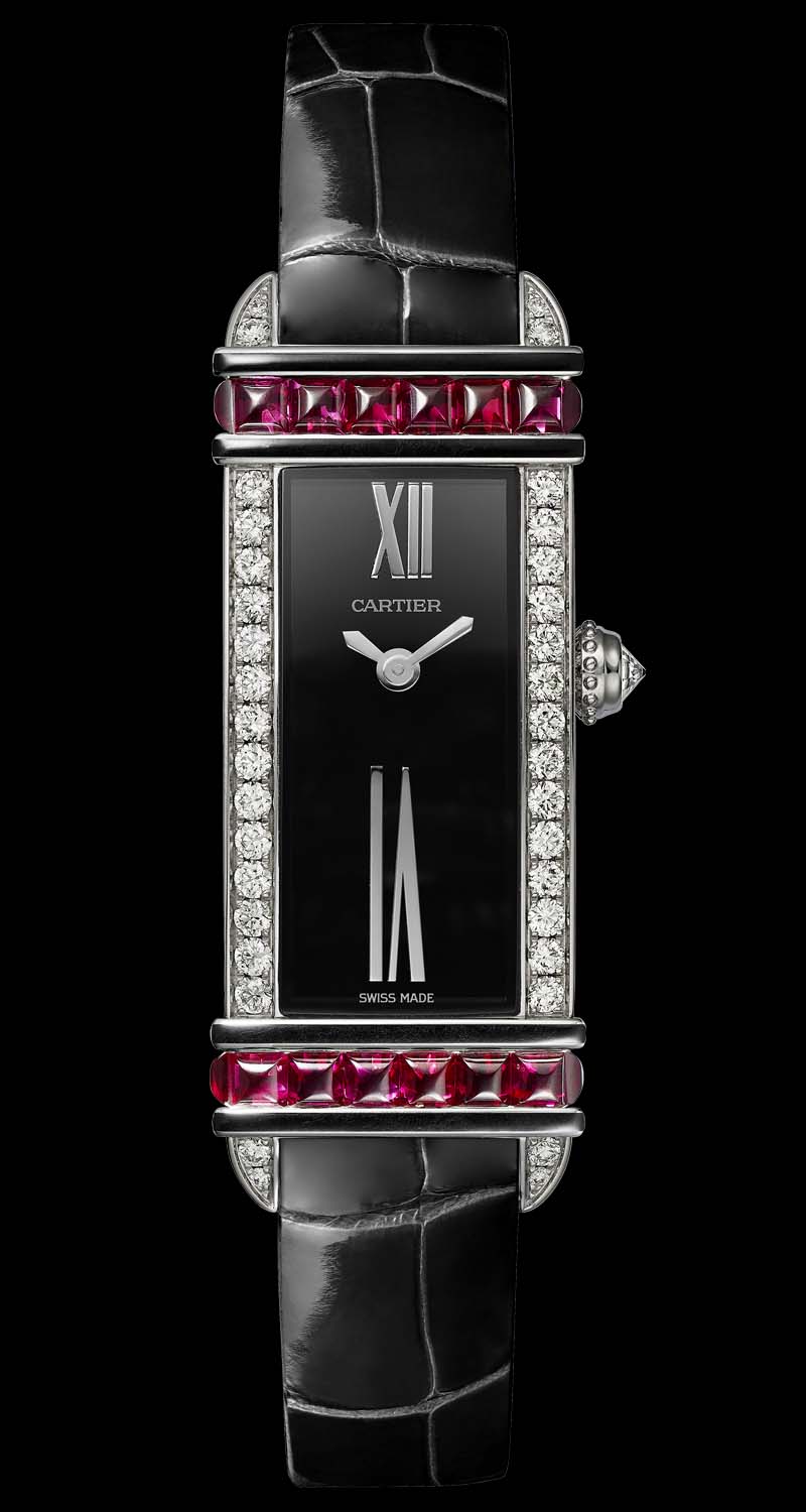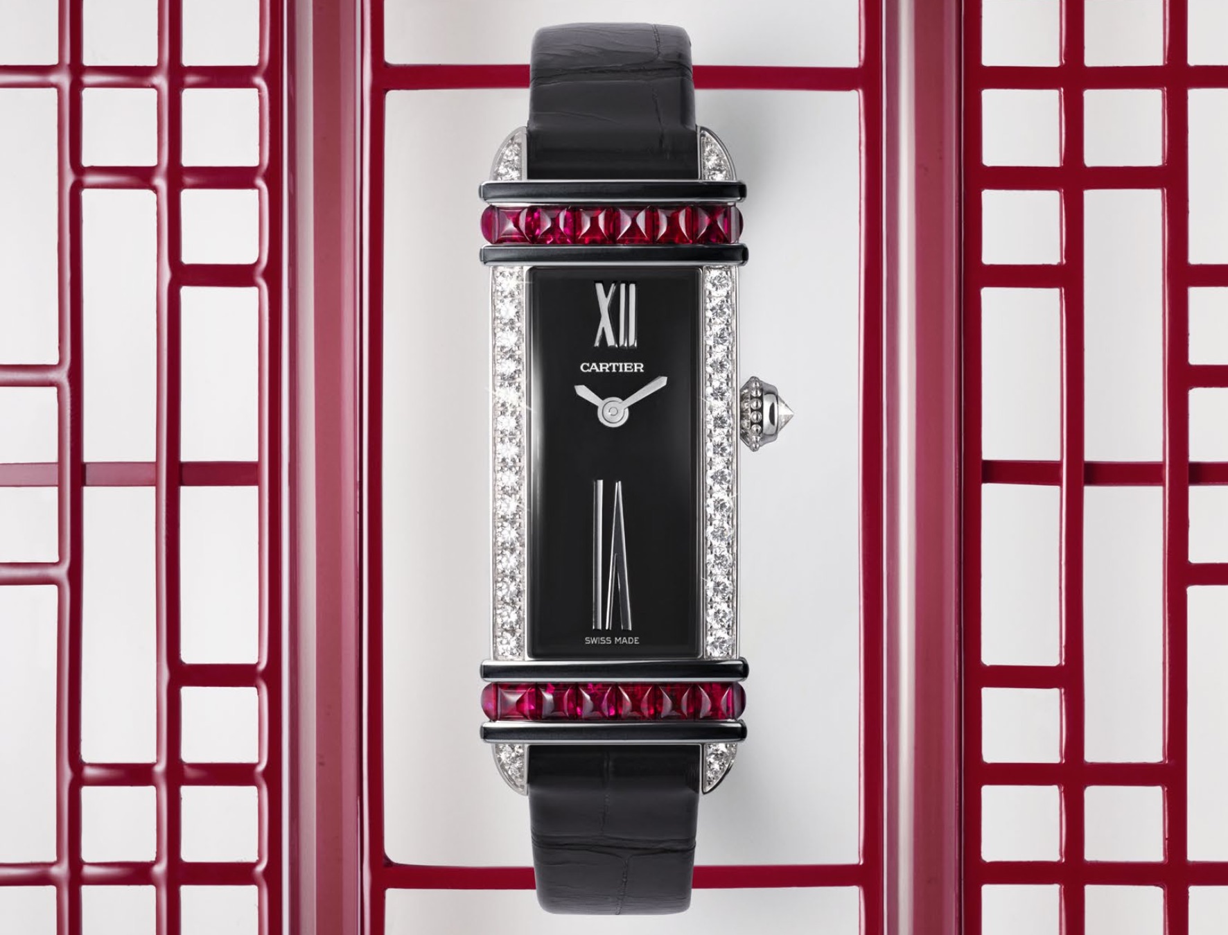 To emphasize the Chinese connection and the unusual shape of the case, two lintels of bright red rubies are set at either of the case and framed by black enamel. The brancards of the inky-black lacquered dial are flanked by 164 brilliant-cut diamonds and the dial features two Roman numerals with an elongated VI to replicate the rectangular thrust of the design. The Tank Chinoise Red Watch is powered by a quartz movement. It comes on a black alligator strap and will be a numbered edition of 100 pieces. Price will likely be around EUR 60,000.
