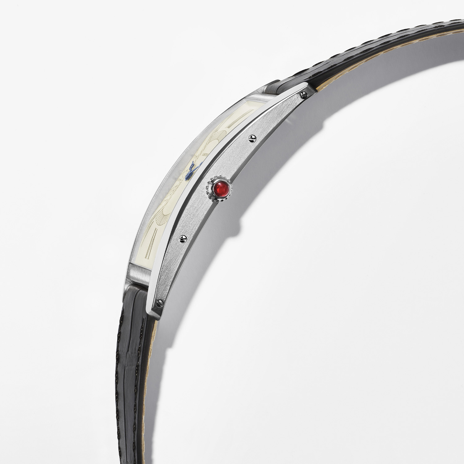 No surprises regarding the dial, which sticks to the design of 1920s versions, with an appealing eggshell colour and black printed Roman numerals and tracks. Classic blued steel apple-shaped hands indicate hours and minutes; again, it omits the Swiss-made mention. Inside the case is the calibre 9780 MC, known to be supplied by Jaeger-LeCoultre – just like vintage examples of the Cintrée. This calibre 849 is a compact hand-wound ultra-thin movement that has enabled JLC to create its thinnest models, such as the Master Ultra Thin Kingsman Knife. It’s not the most high-tech movement, but its 1.89mm profile benefits the Tank Cintrée.