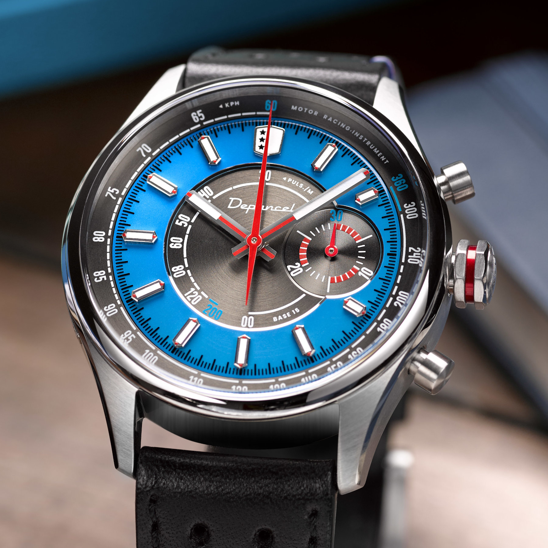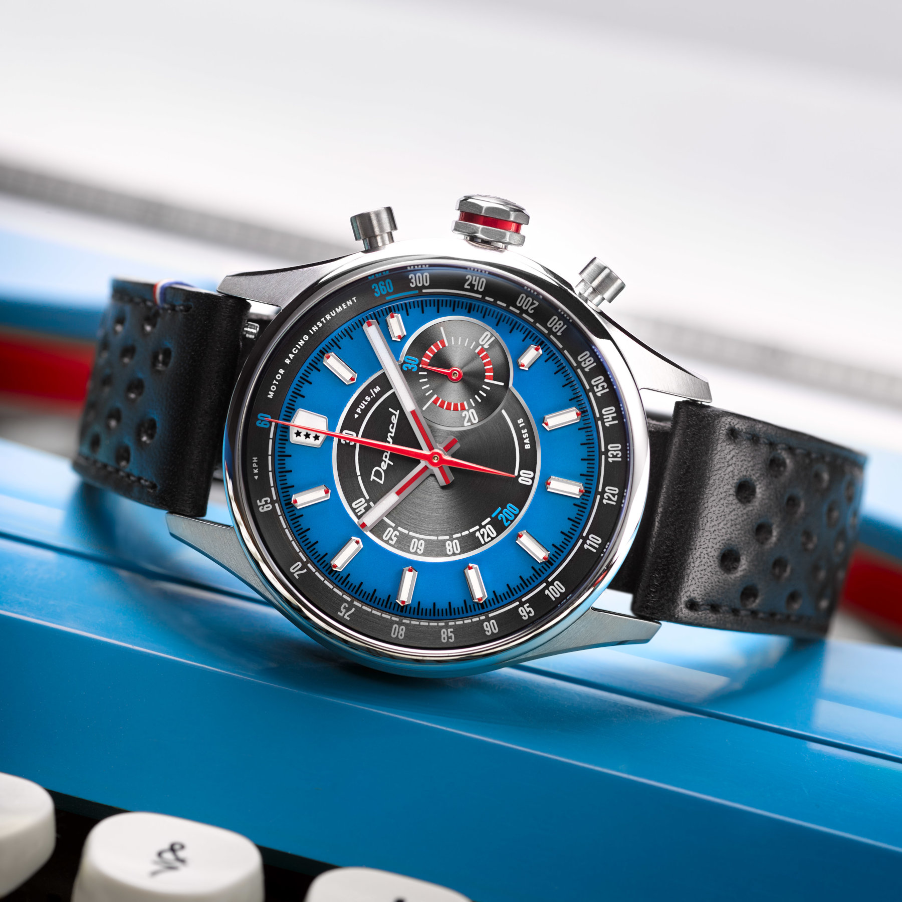 The name Depancel speaks volumes about where this independent French brand finds inspiration. Amalgamating the names of three prestigious French carmakers – Delage, Panhard, and Facel Vega – Depancel and the world of motorsports are inseparable. Its Allure collection of automatic and manual-winding chronographs welcomes a limited edition powered by a restored 1950s Valjoux 92 movement, draped in an iconic racing colour; Bleu de France!