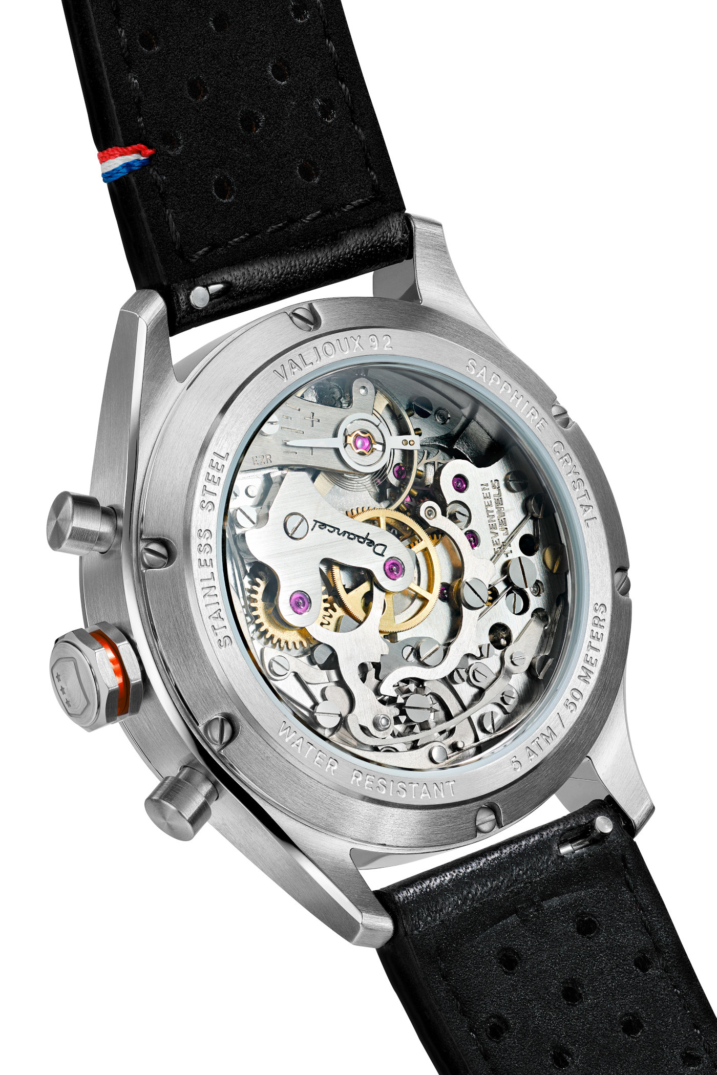 The 1970s marked a before and after in motorsports. Bigger, faster, low-slung F1 machines tore around the tracks piloted by legendary names like Emerson Fittipaldi, Jackie Stewart and Niki Lauda. The distinctive aesthetic that permeated all aspects of motorsports had a profound influence on watch design in the 1970s. Some of the most flamboyant references with groovy-shaped cases and bold colour schemes were produced in this decade, often referred to as the golden age of the chronograph. Depancel taps into this vibe with its bold, colourful chronograph that might remind you of the manual-winding Allure reference released last year. While many of the external features and some details of the dial are similar to those of the 2024 references, the limited edition boasts a fascinating 1950s Valjoux 92 calibre, produced during the golden age of mechanical chronographs.