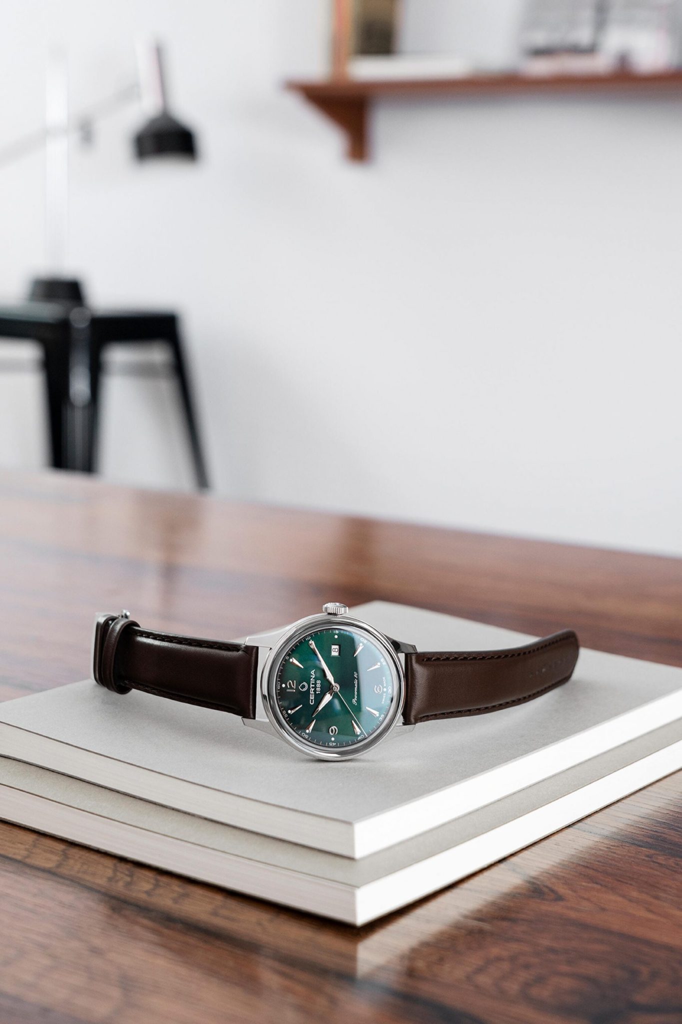 The new Certina DS Powermatic is available with white, blue, gold, green and brown dials, all with a refined sunburst finish and a date window at 3 o’clock. A discreet minutes/seconds track and a very thin and elongated blued central seconds hand complete the package