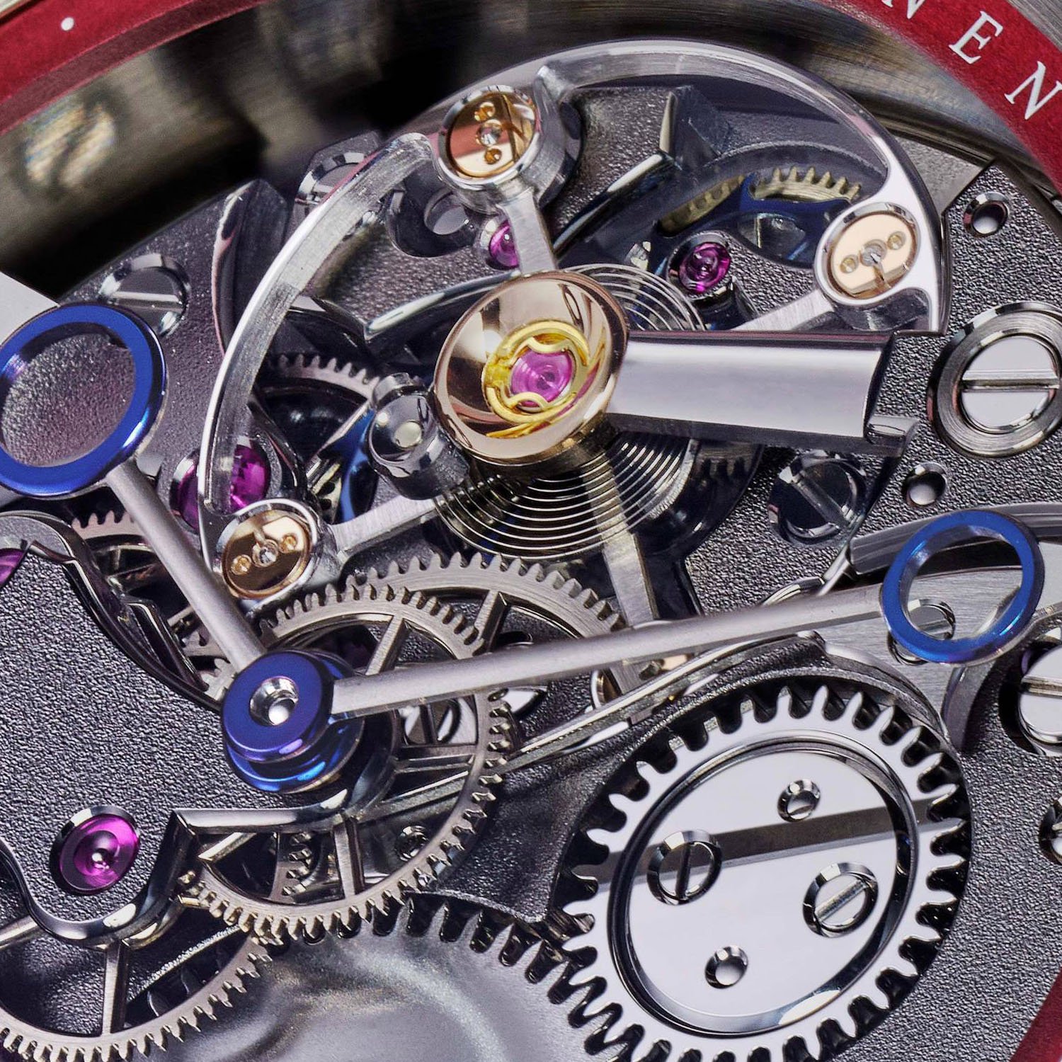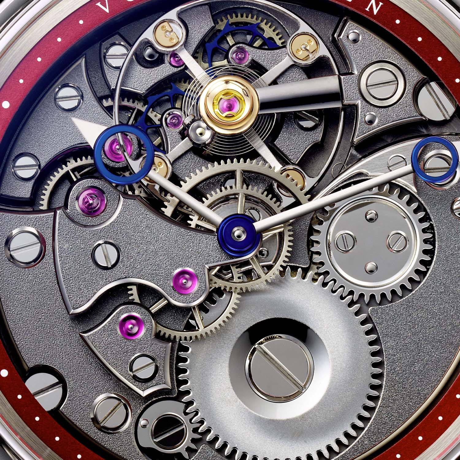 A titanium case and bold cherry-red accents for Voutilainen's splendid inverted watch.