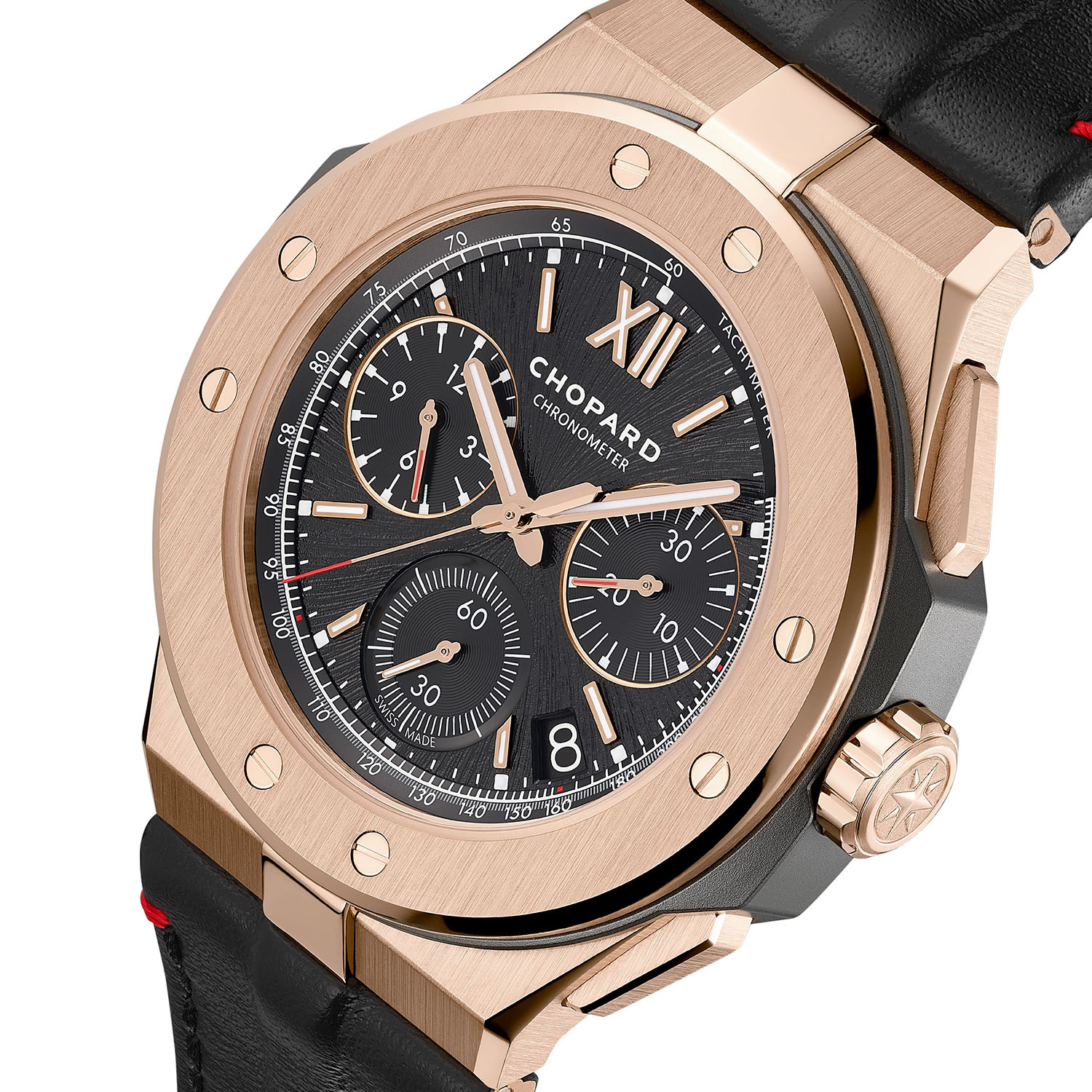 Chopard's sporty flyback chronograph is revisited in a handsome pink gold and ceramised titanium case with a dark dial and calfskin leather strap.