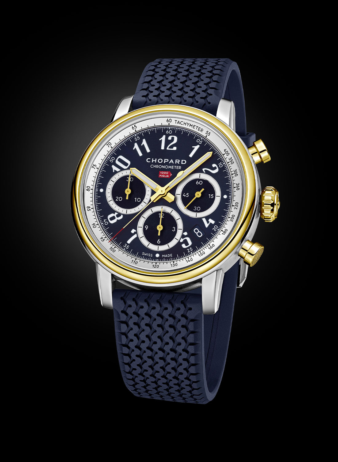 In their seventh collaboration, renowned race car driver and six times Le Mans winner Jacky Ickx and Chopard‘s Co-President Karl-Friedrich Scheufele have crafted a timepiece that honours the racing legend but also celebrates their 36-year friendship fueled by a mutual love for motorsport and exquisite watches. Inspired by the distinctive blue-coloured helmets worn by Ickx since 1972, the new Mille Miglia chronograph once again captures the essence of the series.