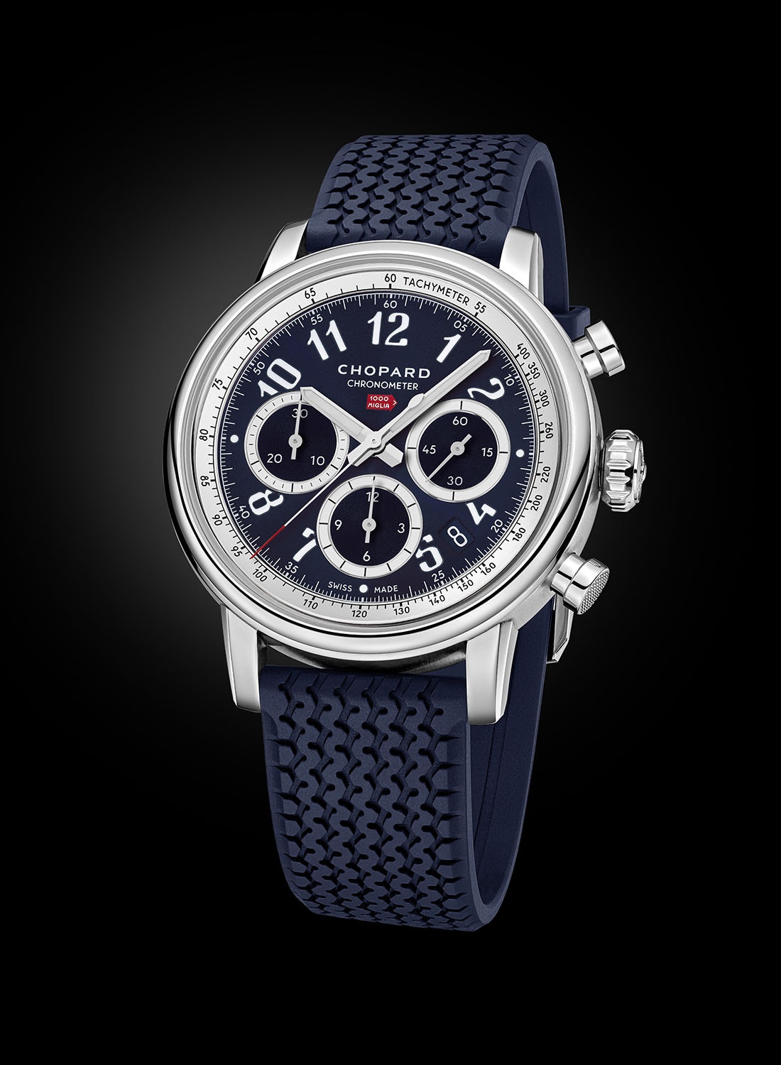 The new Chopard Mille Miglia Classic Chronograph JX7 is paired with a midnight blue 1960s Dunlop tyre-tread pattern rubber strap, which matches the dial. The strap is secured with a pin buckle. The JX7 comes in a special presentation box with a miniature reproduction of the legendary helmet. The all-steel version costs EUR 11,100, while the steel and gold variant costs EUR 13,000. For further details, visit chopard.com.
