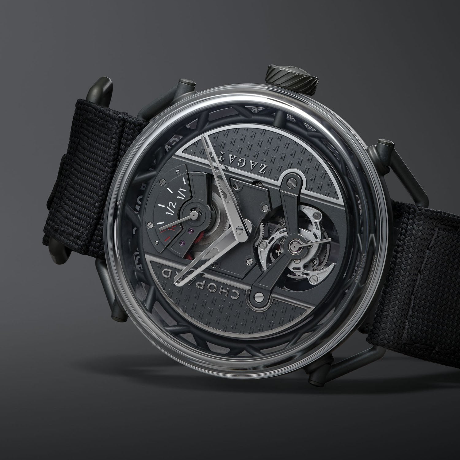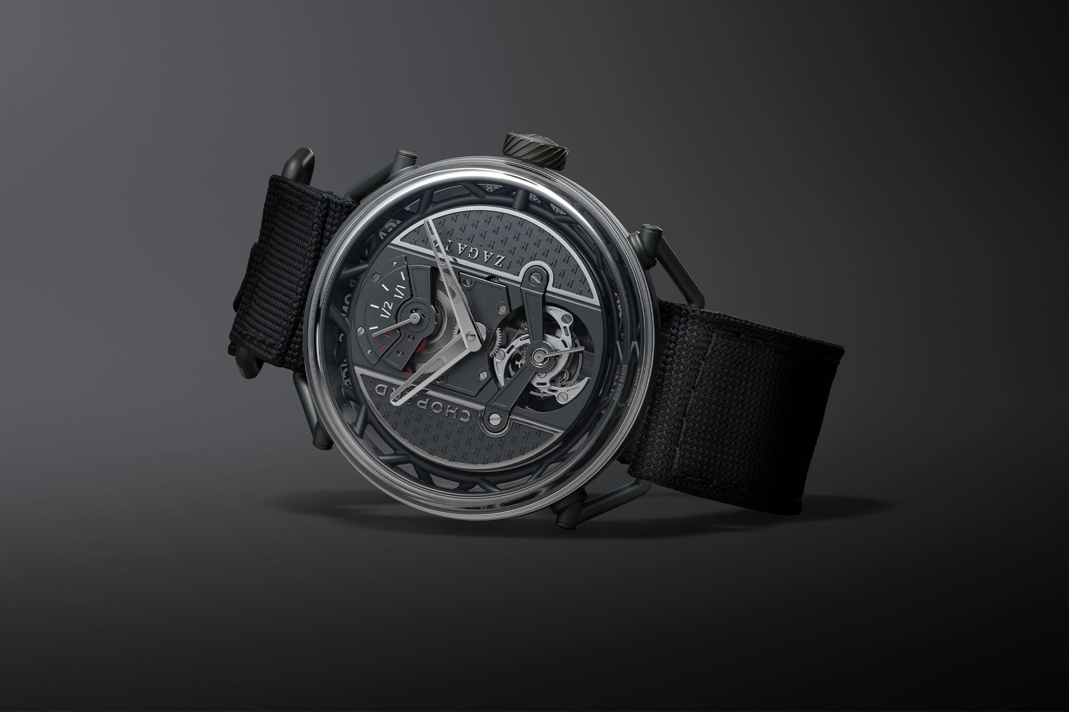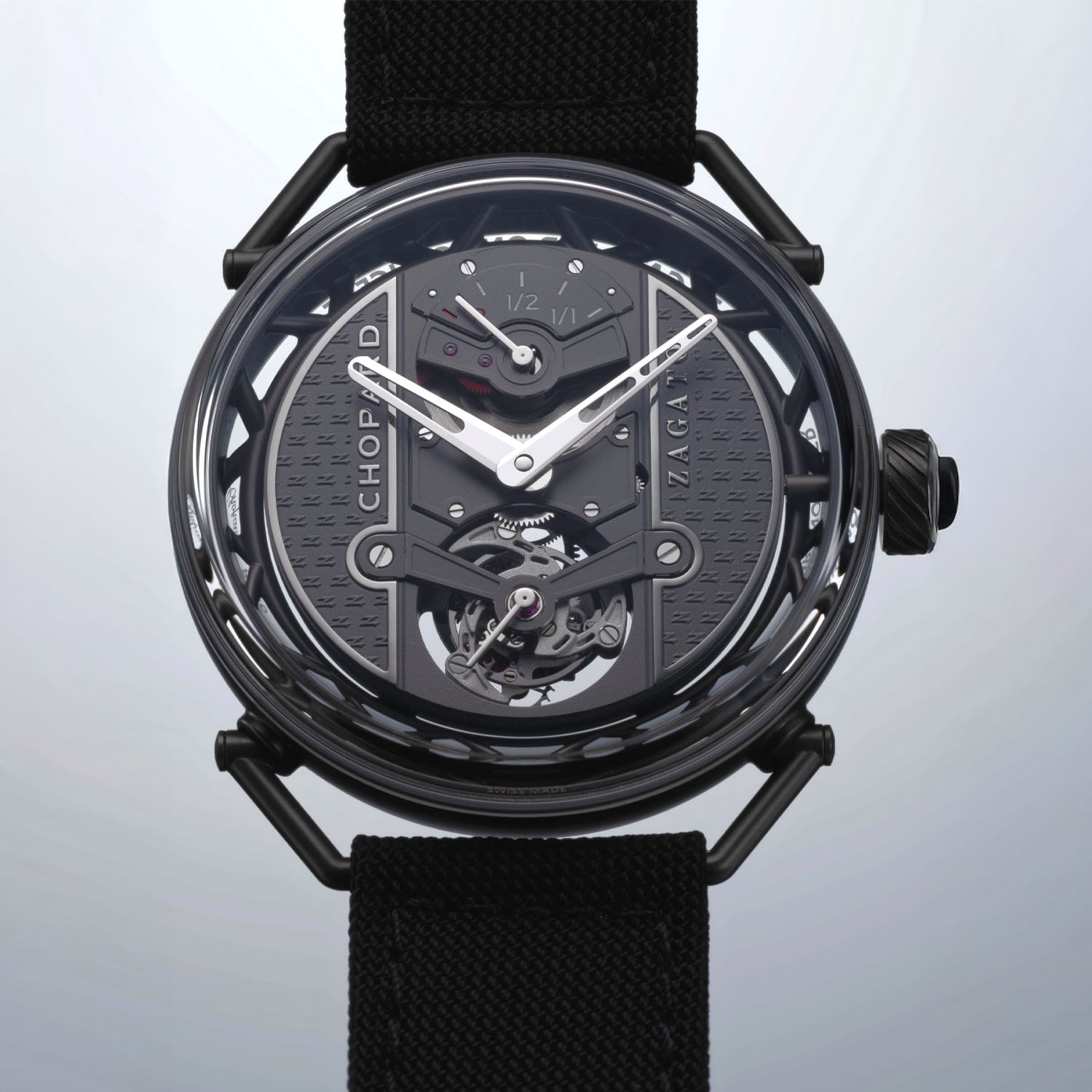The Zagato Lab One Concept is delivered with two straps: a technical fabric strap with hook-and-loop fastening, and a calfskin leather strap with a ceramicised titanium pin buckle for a more classic look. Produced as a 19-piece limited edition in ceramicised titanium, the watch is available exclusively through Chopard and is priced at CHF 130,000. For more details, visit chopard.com.