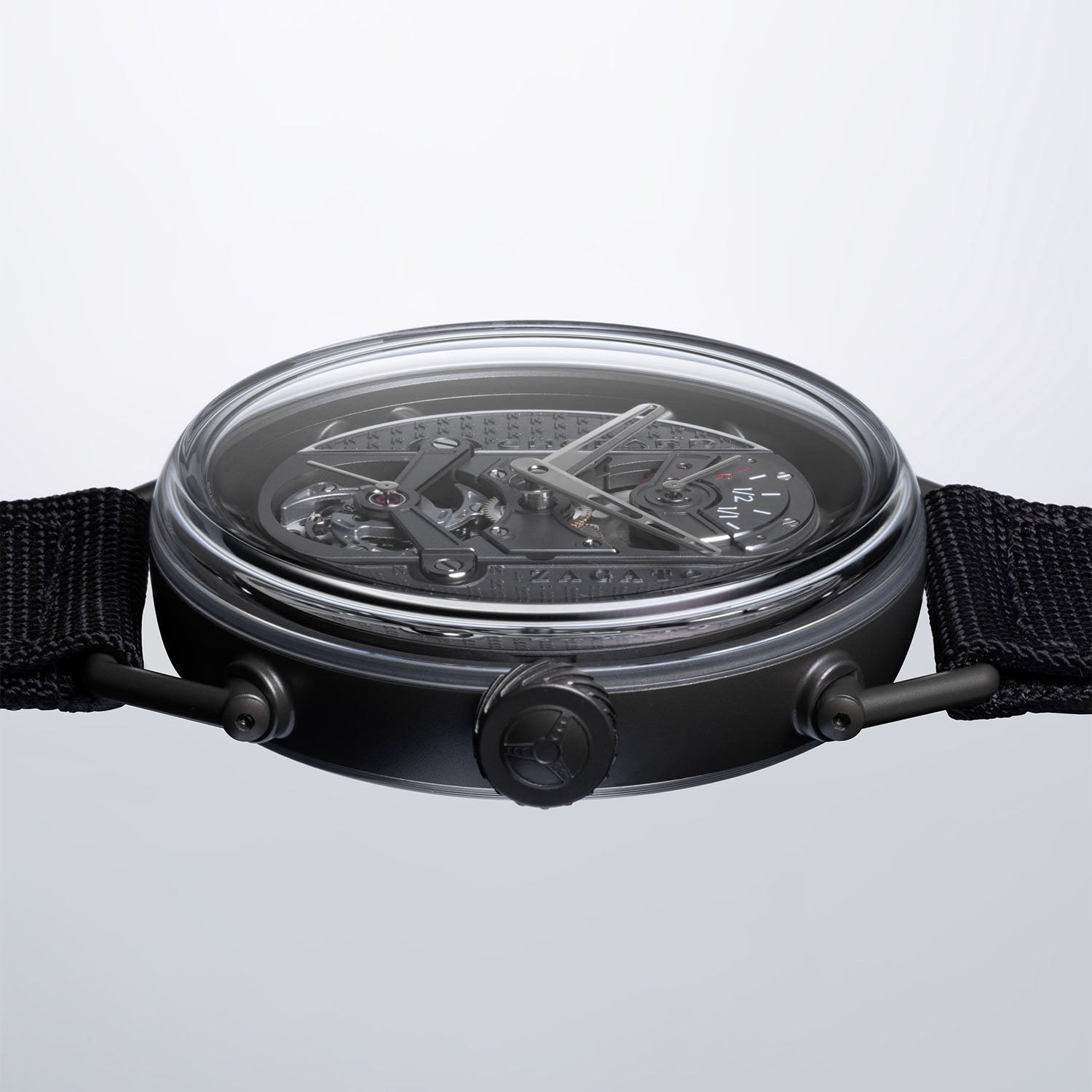 The dial is fully integrated into the movement. The ceramicised titanium mainplate doubles as the display surface and is decorated with Zagato’s signature “Z”, machined in relief and finished with rhodium-plated chamfers. Openworked hands, inspired by steering wheels, underline the motorsport theme, enforced by the fuel gauge-style power reserve at 12 o’clock.