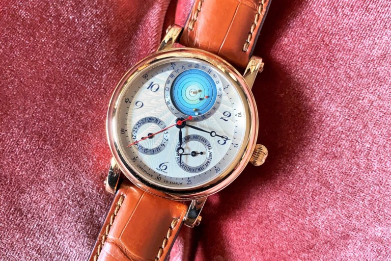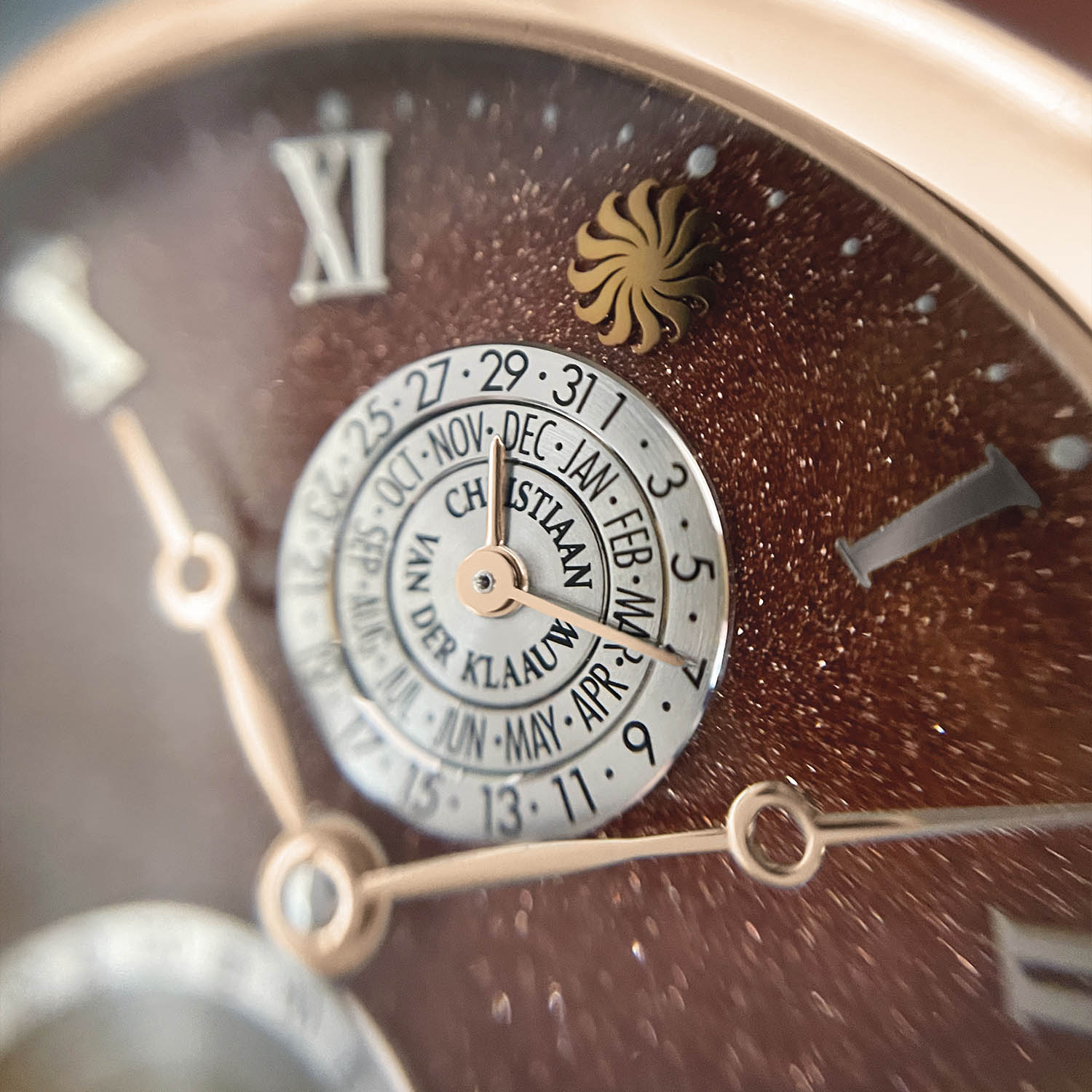 The planetarium module on top of the 7386 is an in-house child of Christiaan van der Klaauw who presented his creation in 1999. Since then, it has remained the most miniature Planetarium ever and is a coveted complication. Van Cleef & Arpels, famous for their creativity and respect towards independent watchmakers, commissioned Christiaan van der Klaauw twice for the exclusive development of the planetarium module for VCA’s Poetic Complications. And last year’s CVDK Planetarium Eise Eisinga was awarded the “Calendar and Astronomy Watch Prize” by the GPHG.