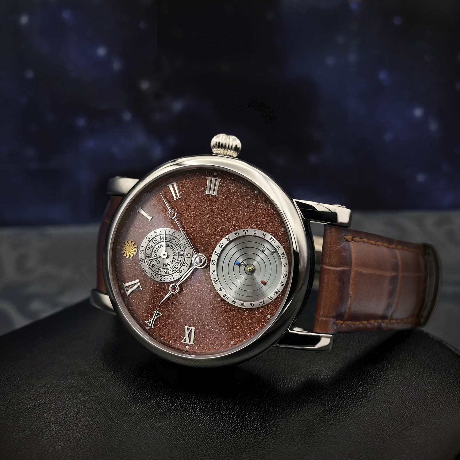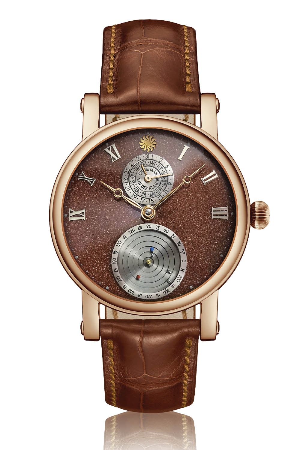 The aventurine dial red and the rhodium-plated silvery-white colours work very well with 40mm diameter round steel, white or rose gold cases chosen for this Planetarium Dunes of Mars edition. The harsh cold of steel creates a feeling of better fitting when looking at the images, but the watches must be seen in person. The caseback is transparent, and the movement inside is CVDK7386, with automatic winding powered by a twin barrel to let the watch run non-stop for a maximum of 96 hours. It is decorated up to the high standards of haute horlogerie, and the rotor with engraved planets, stars and “zonnenklauw”, the sun logo, is a beautiful object in itself.