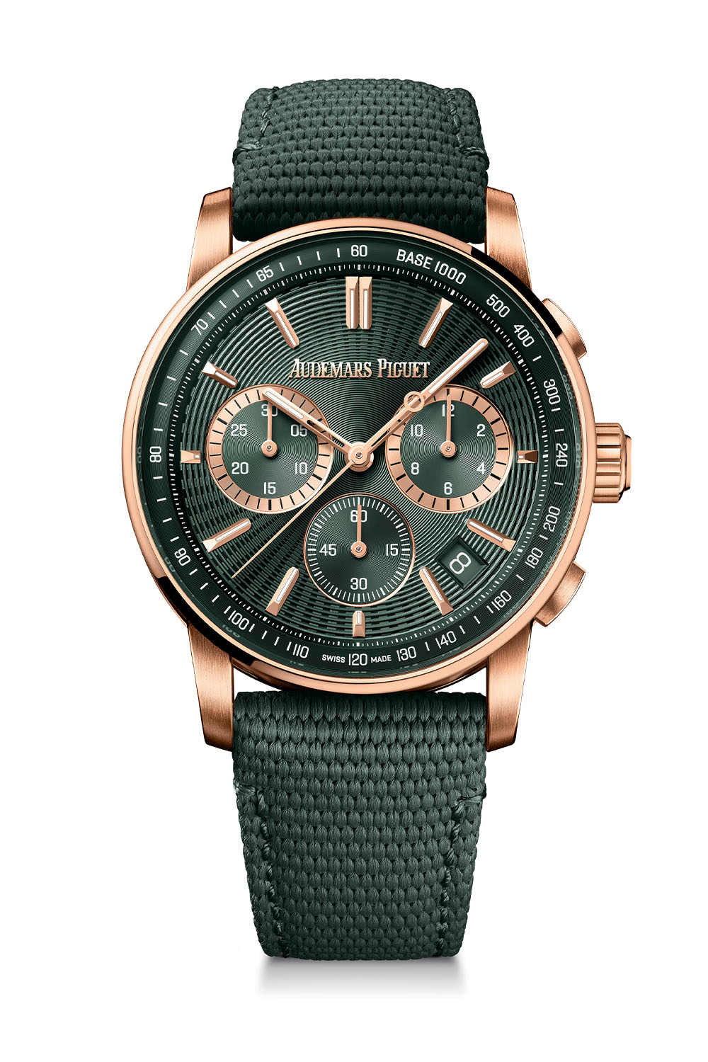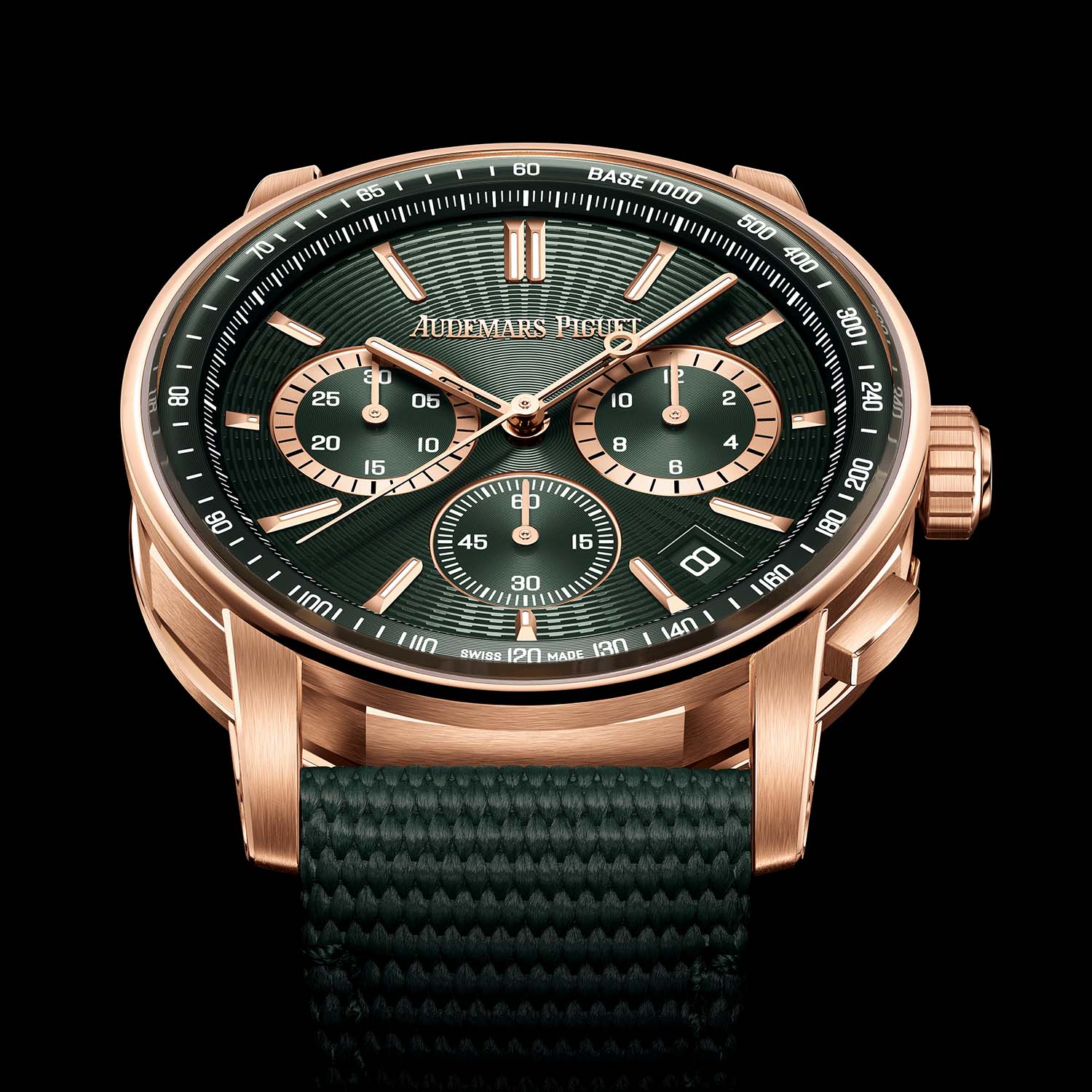 Initially introduced with the stainless steel models, green now graces the embossed dials and inner bezel rings of the pink-gold-cased Code 11.59 Selfwinding 41mm and Selfwinding Chronograph 41mm. The Selfwinding Chronograph 41mm features green counters at 3 and 9 o’clock with pink gold rings, while the 6 o’clock sub-dial lacks the external gold zone. Specifications remain consistent across the series: the time and date 41mm is driven by calibre 4302, and the flyback chronograph is powered by calibre 4401; both operate at 28,800 vibrations/hour and have a power reserve of 70 hours.