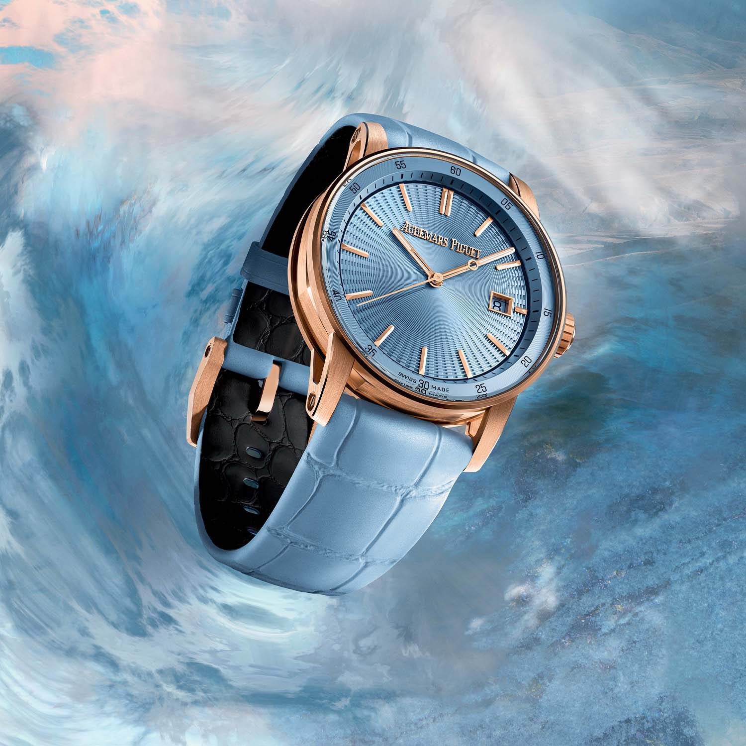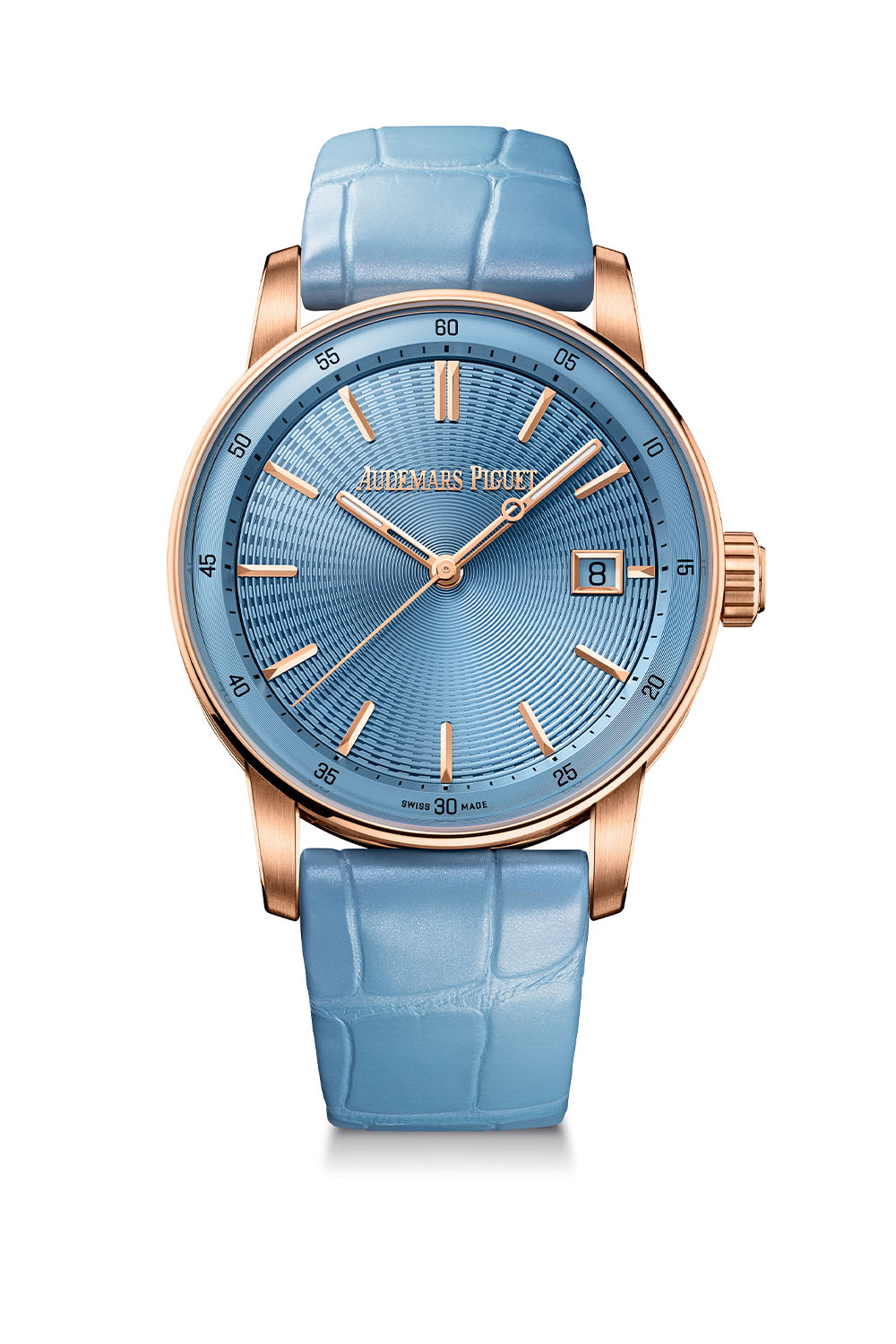 Among the seven new Code 11.59 pink gold references, two offer time and date functionality within 38mm cases (recently added to the collection). These self-winding 38mm timepieces, with a Vaucher-based movement, stand out for their distinct dial colours and matching alligator leather straps. One variant showcases a luminous light blue dial paired with a “pearly light blue alligator strap with large-scale squares“. At the same time, the second boasts the signature Bleu Nuit, Nuage 50 dial (a colour that has long been the exclusivity of the RO Jumbo 39mm) and a pearly dark blue alligator leather strap. Both straps are secured with a gold pin buckle, and textured rubber straps in light blue or dark blue are also included for added versatility.