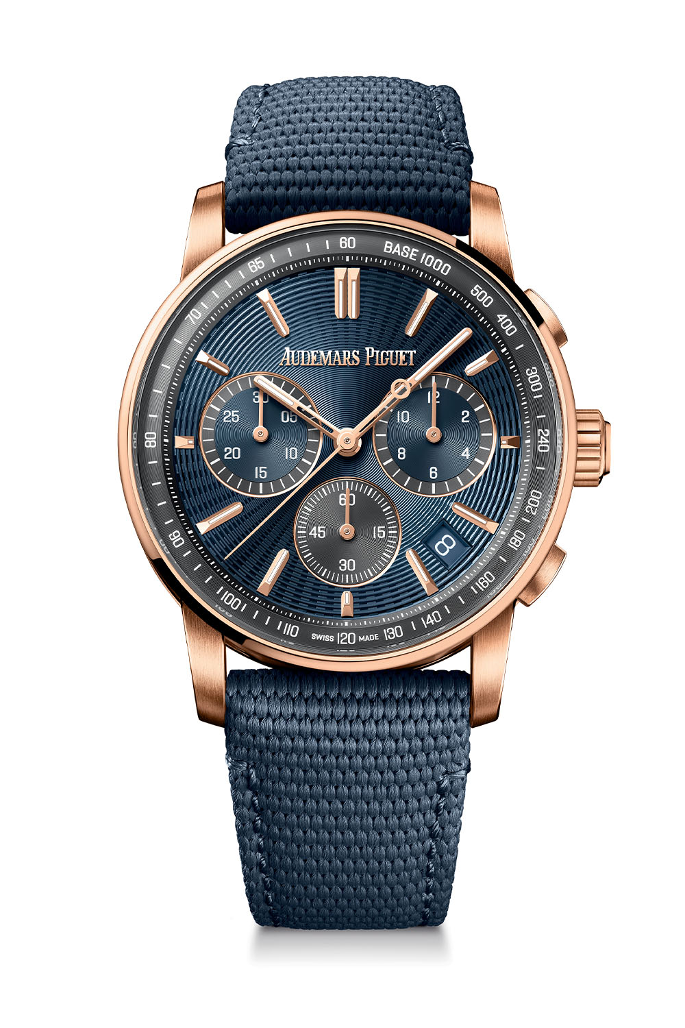 Other standout models featuring the emblematic “Bleu Nuit, Nuage 50” coloured and embossed dial (though with a grey inner bezel) are the Selfwinding 41mm and the Selfwinding Chronograph 41mm. The Chronograph, driven by AP’s automatic Calibre 4401 with a flyback function, showcases a dial with two blue counters framed in grey at 3 and 9 o’clock, complemented by an all-grey sub-dial at 6 o’clock matching the colour of the inner bezel.