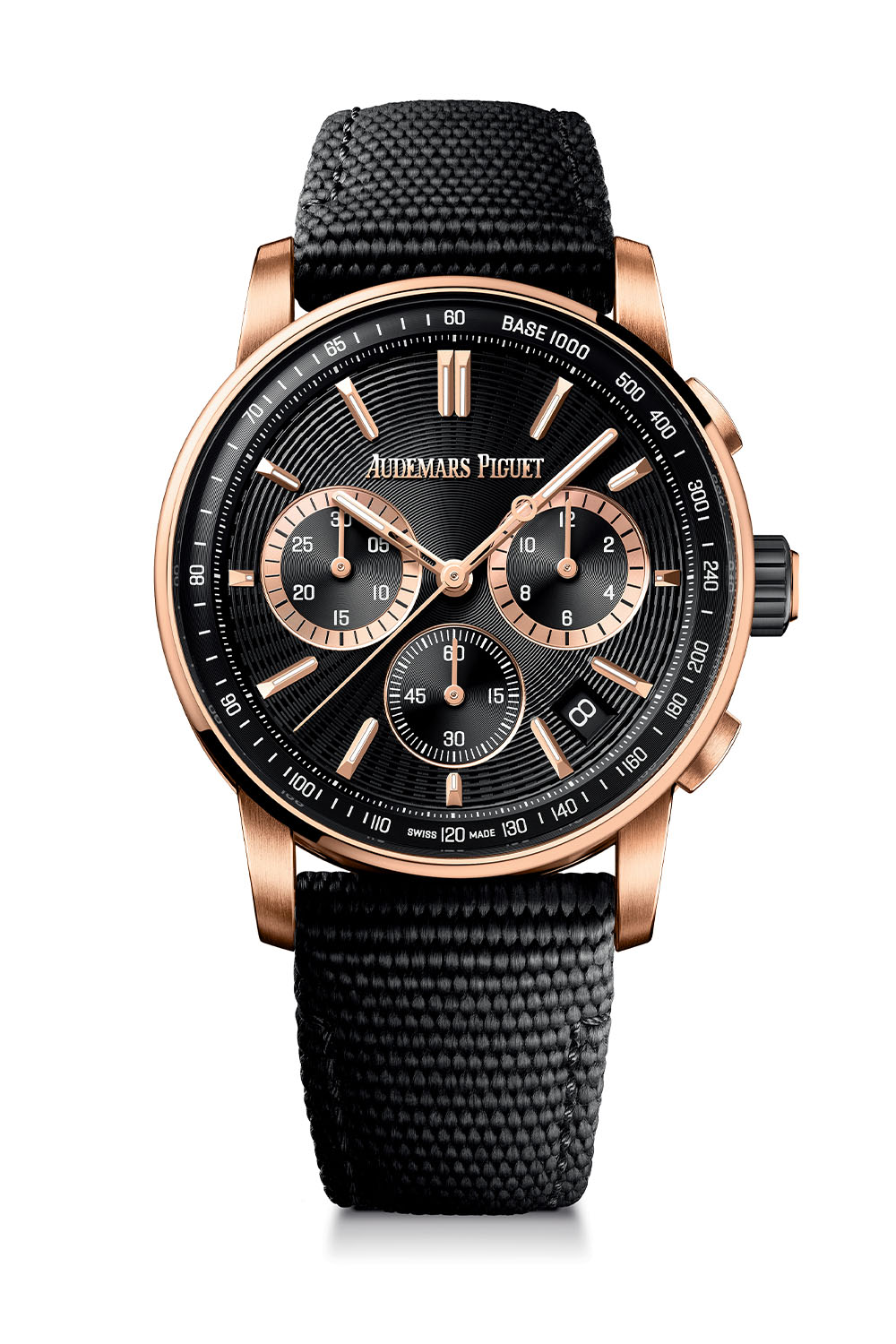 Audemars Piguet rounds out the palette with a Code 11.59 Selfwinding Chronograph in a 41mm pink gold case with a black ceramic middle case and crown, boasting a black dial with a stamped motif and a black inner bezel ring. This model showcases black chronograph counters with external gold rings, a black small seconds subdial at 6 o’clock, and uniform pink gold applied hour-markers and hands with luminescent material, ensuring a cohesive design throughout the series.