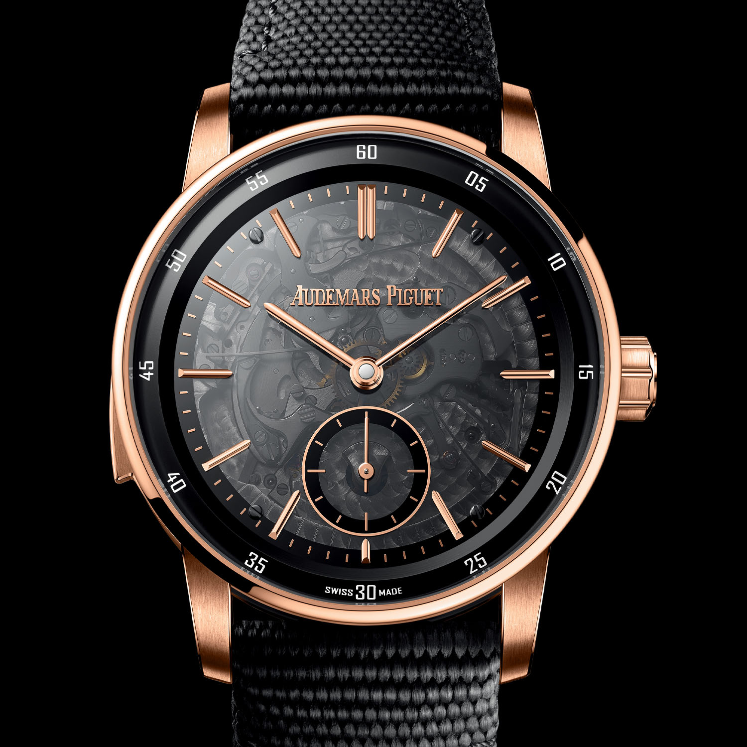 The Code 11.59 by Audemars Piguet Minute Repeater Supersonnerie with smoked sapphire dial is presented on a black textured rubber-coated strap with a gold AP folding buckle. The price is upon request.