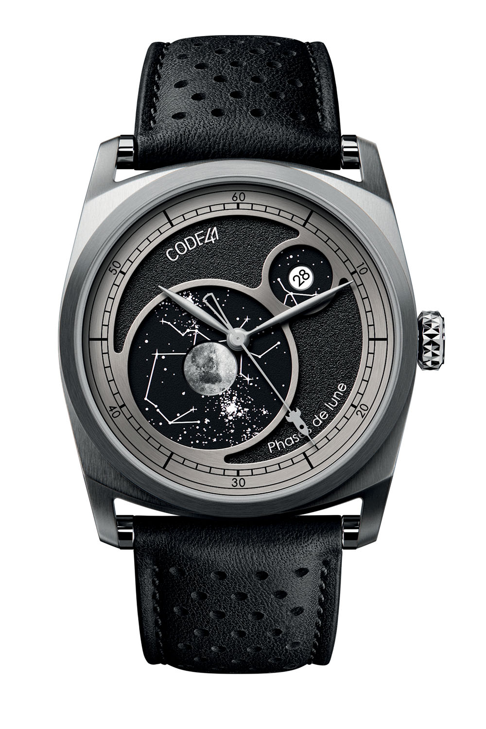 Powering the Code41 Moon Inception is the C41-MP calibre, based on the Sellita SW288 (Elaboré). It has 26 jewels, beats at 28,800vph (4Hz) and comes with a 41-hour power reserve. Functions include central hours, minutes, hacking seconds, moonphase and date. Adjusted in three positions, accuracy is rated at +/-7 seconds per day, but there’s an optional COSC-certified upgrade that brings it to -4/+6 seconds per day (with certificate). Decorations include perlage and a custom rocket/space theme engraved on the rotor.