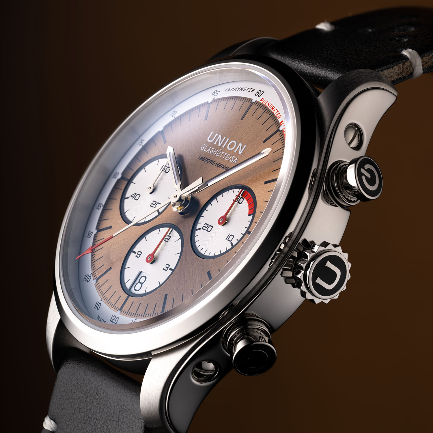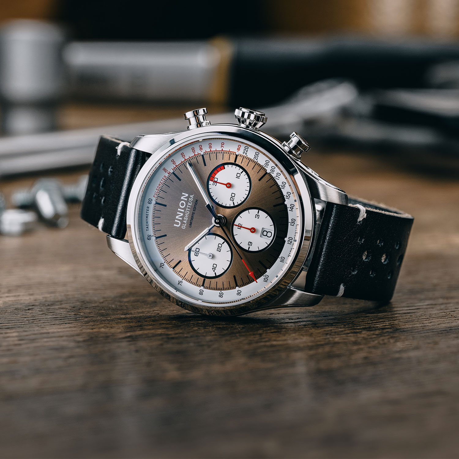 The Belisar Chronograph is available with a stainless steel bracelet or a rally-style perforated leather strap. This stylish, well-built chronograph is a limited edition of 200 pieces and retails for EUR 3,450 (incl. tax). For more information, please consult union-glashuette.com.