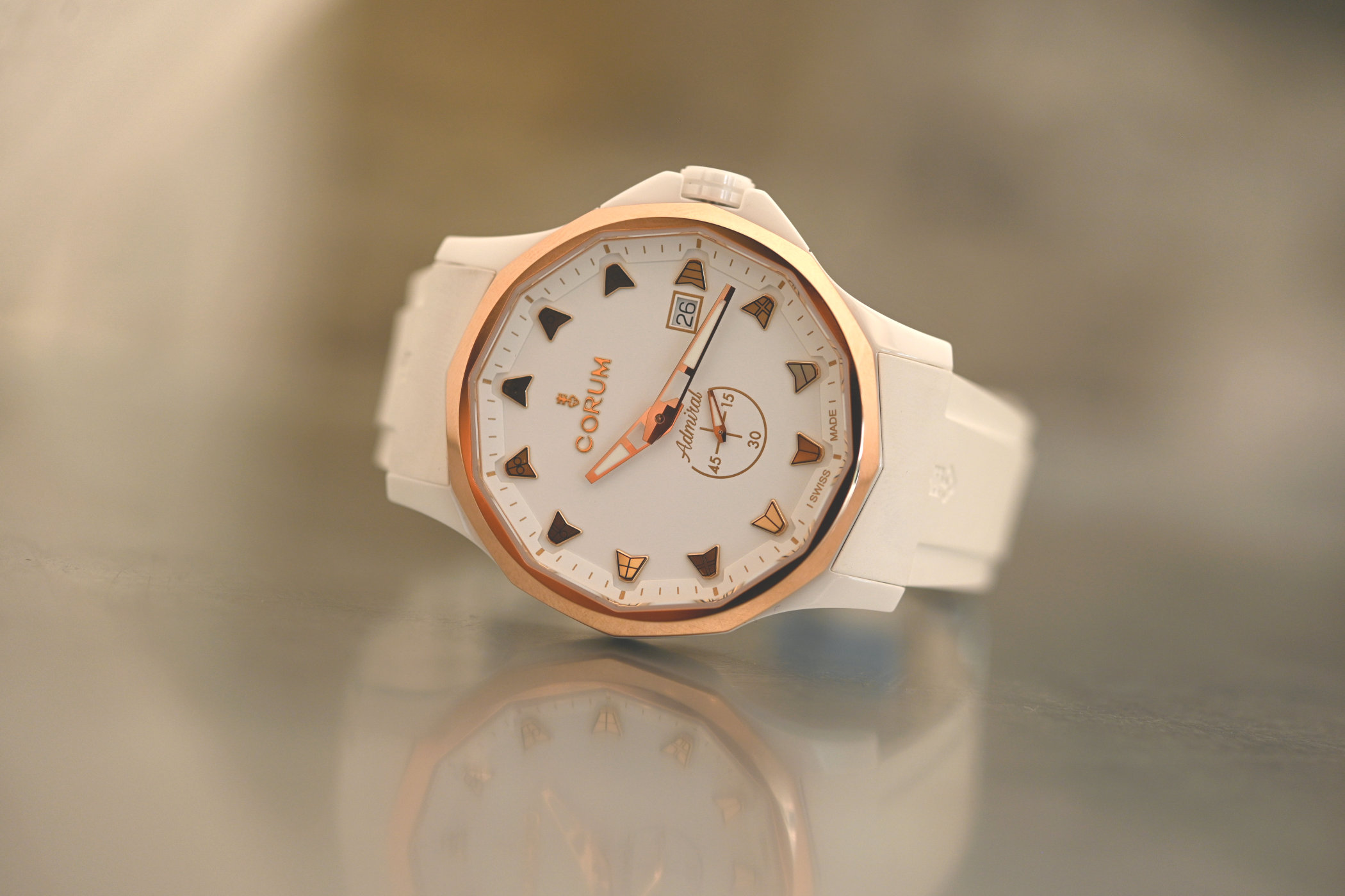 Four different versions are presented. The first two are straightforward classics with a combination of white or black ceramic and a pink gold bezel. Matching the colour of the case, the sunray dial features the nautical flag appliques. The other two variations are more unexpected. The first one comes in a full white ceramic case with splashes of colour all over the dial. The last one is a 50-piece black ceramic limited edition with a large Corum graffiti logo across the dial. Luminescent, it is hardly noticeable during the day but shines bright at night.