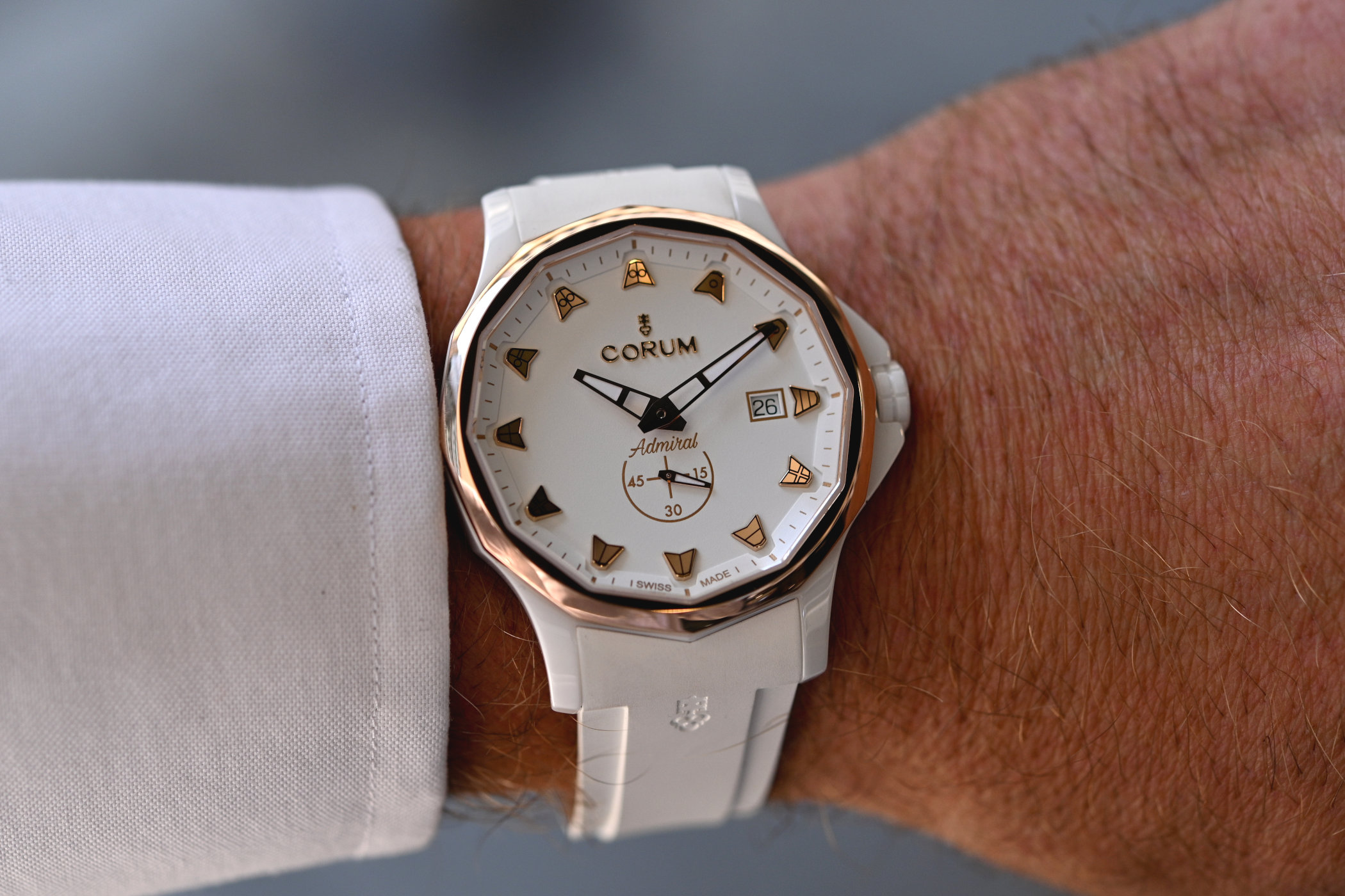 The Corum Admiral Automatic 42 comes on an integrated rubber strap matching the colour of the case. It is secured to the wrist by a steel triple-folding clasp. The price is set at CHF 18,000 for the pink gold bezel versions and CHF 14,800 for the full ceramic versions.