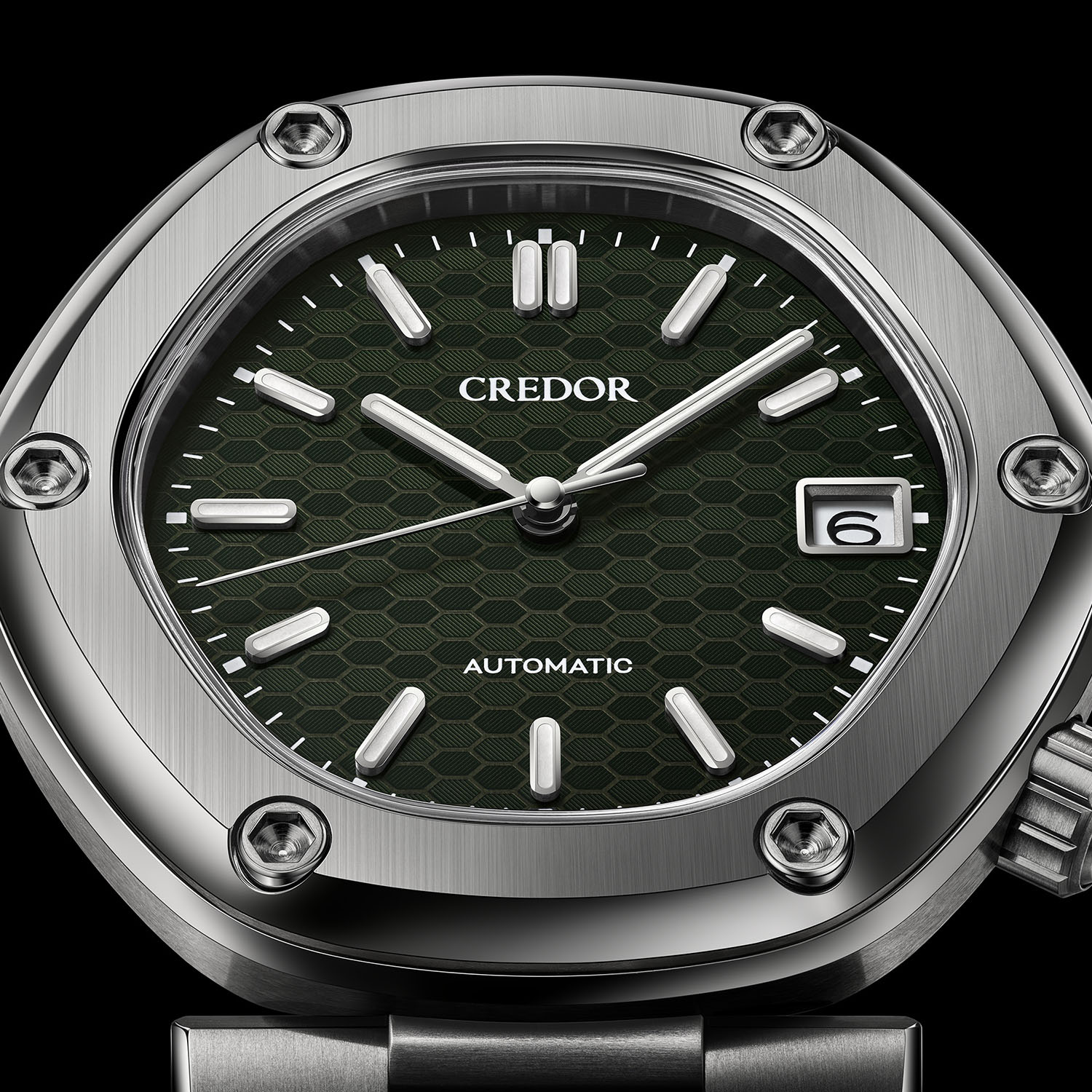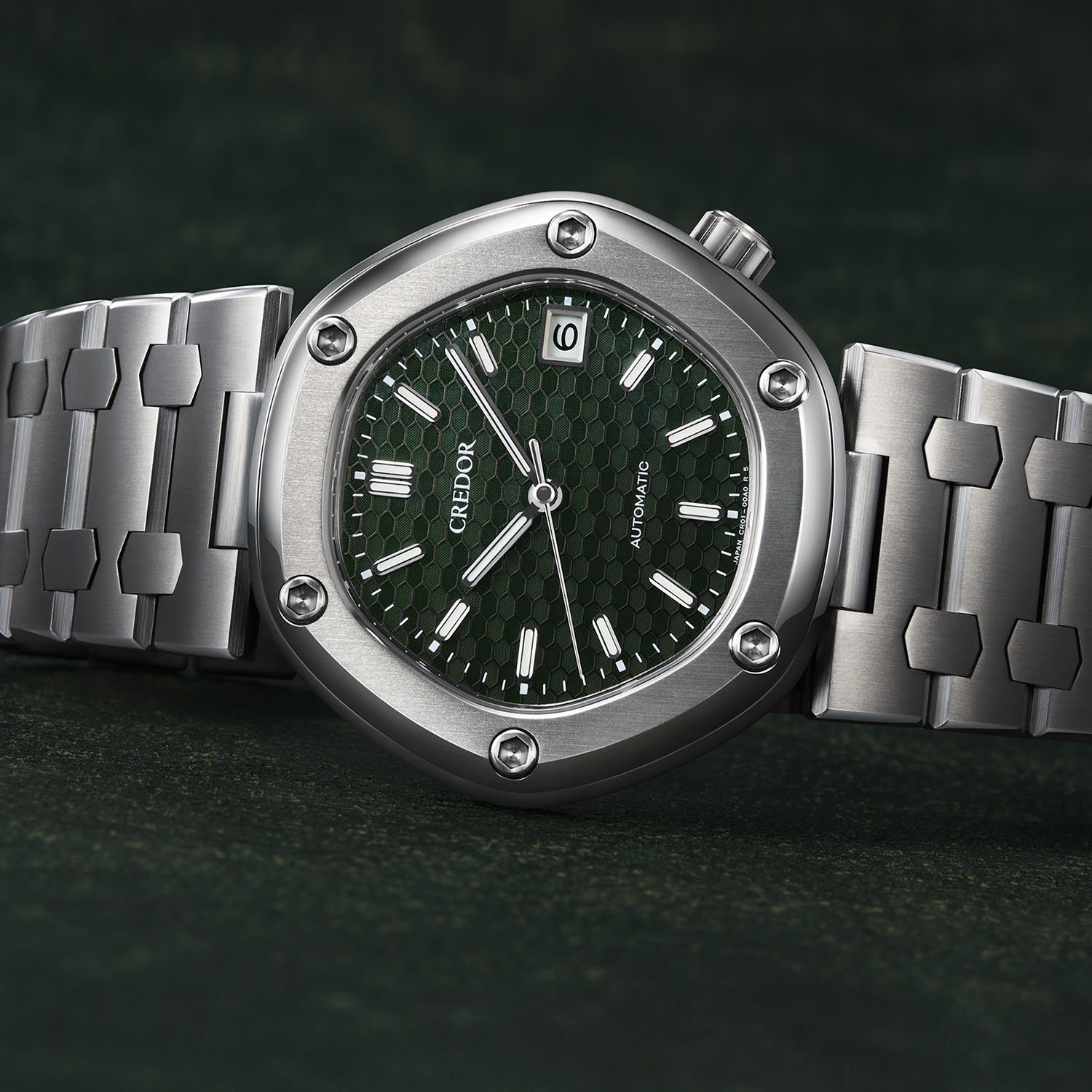 The dial is what changes mostly here. It is said to be “inspired by the green signal lights of the railway system” – a bit of a stretch, perhaps, but still striking. It features a textured pattern of small green hexagons, each with a striped, woven-like finish that catches the light, creating a shimmering honeycomb effect. Applied luminous indices and hands stay true to the 2024 Locomotive edition; the framed date window sits at 3 o’clock, with the Credor logo and “Automatic” text providing a nice visual balance. A tiny print at the bottom of the dial nods to the movement and the watch’s origins.