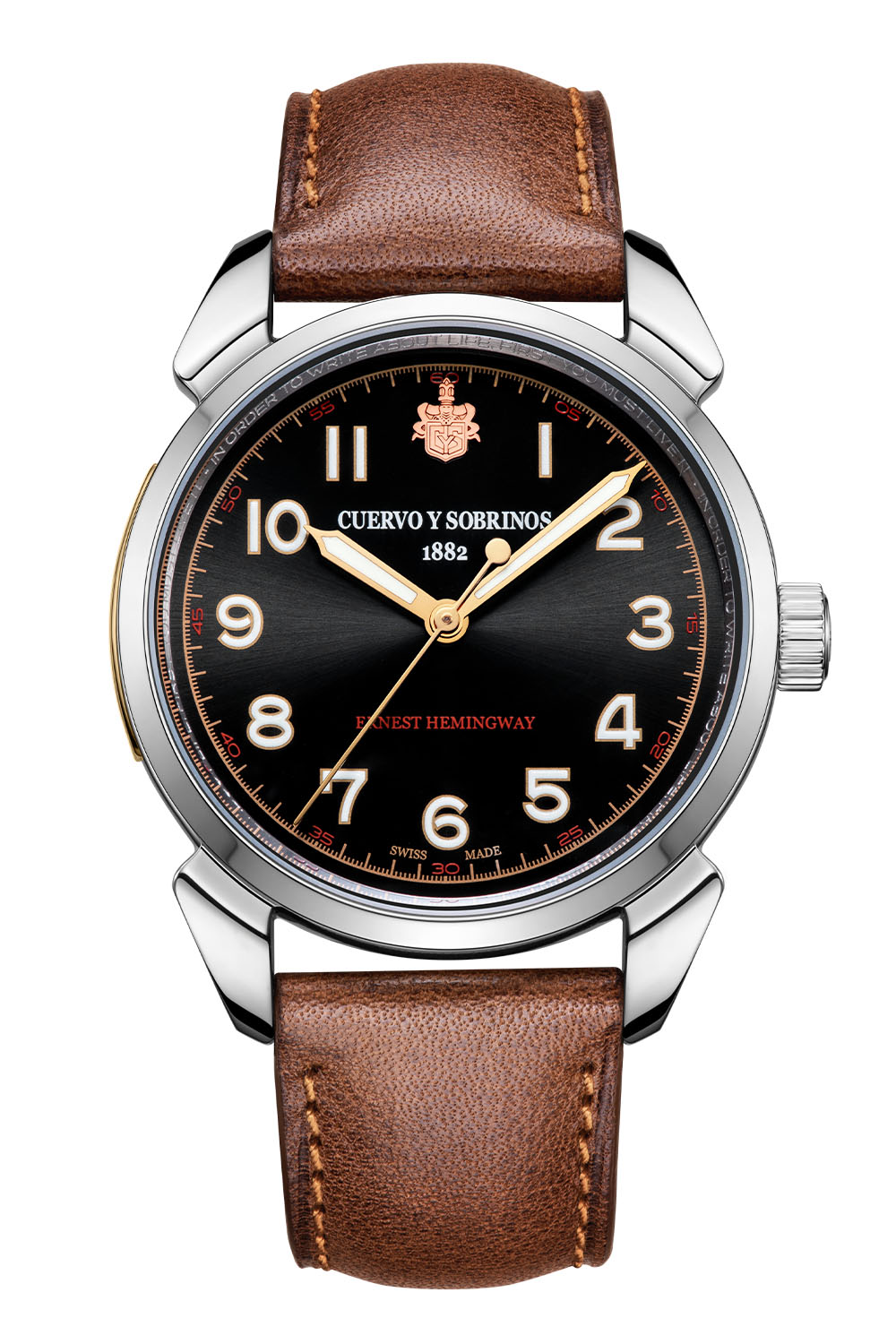 Available in four dial colours – cream, brown, black and silver – the dial’s flange is inscribed with a Heminway quote: “In order to write about life, first you must live it”. Both the Arabic numerals and hands are filled with Super-LumiNova, and the brand’s coat of arms is applied at noon. The minute track features red numerals at 5-min intervals to match the inscription ‘Ernest Hemingway’ at 6 o’clock.