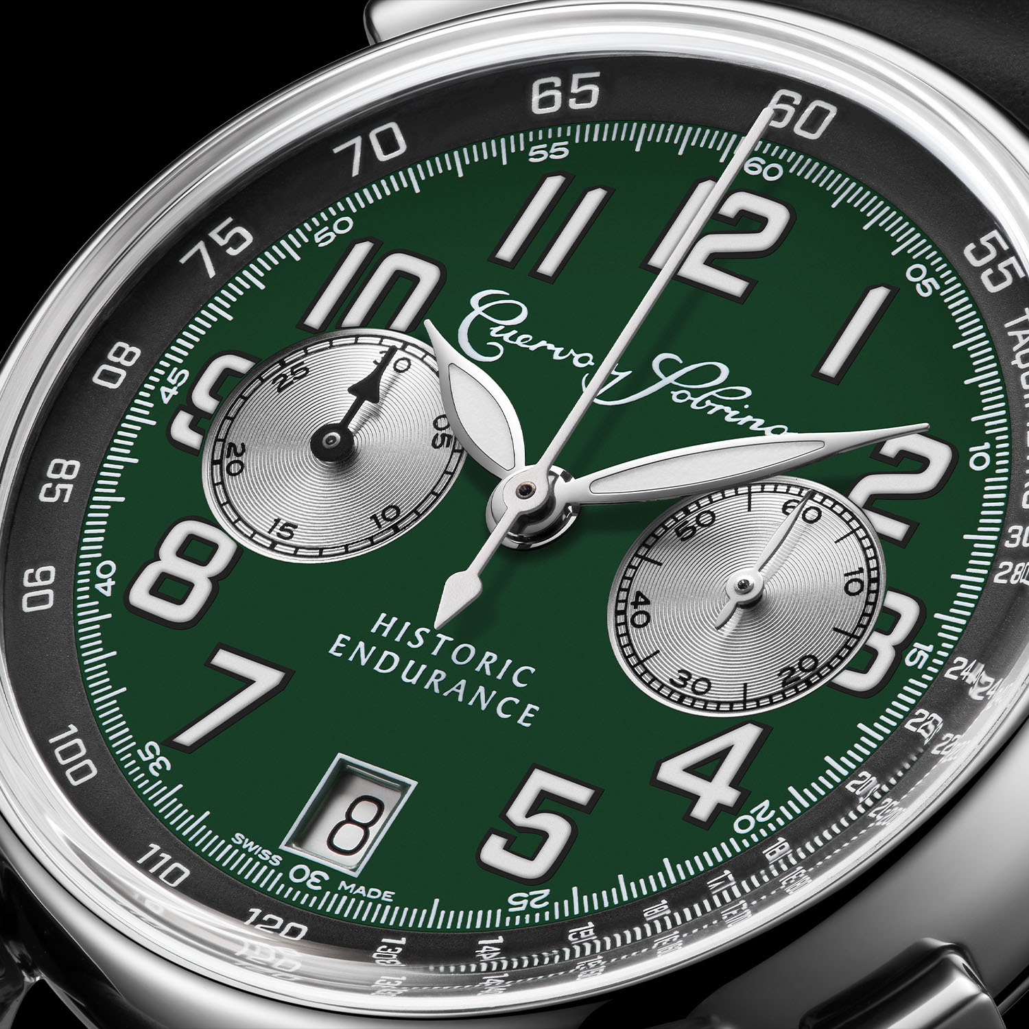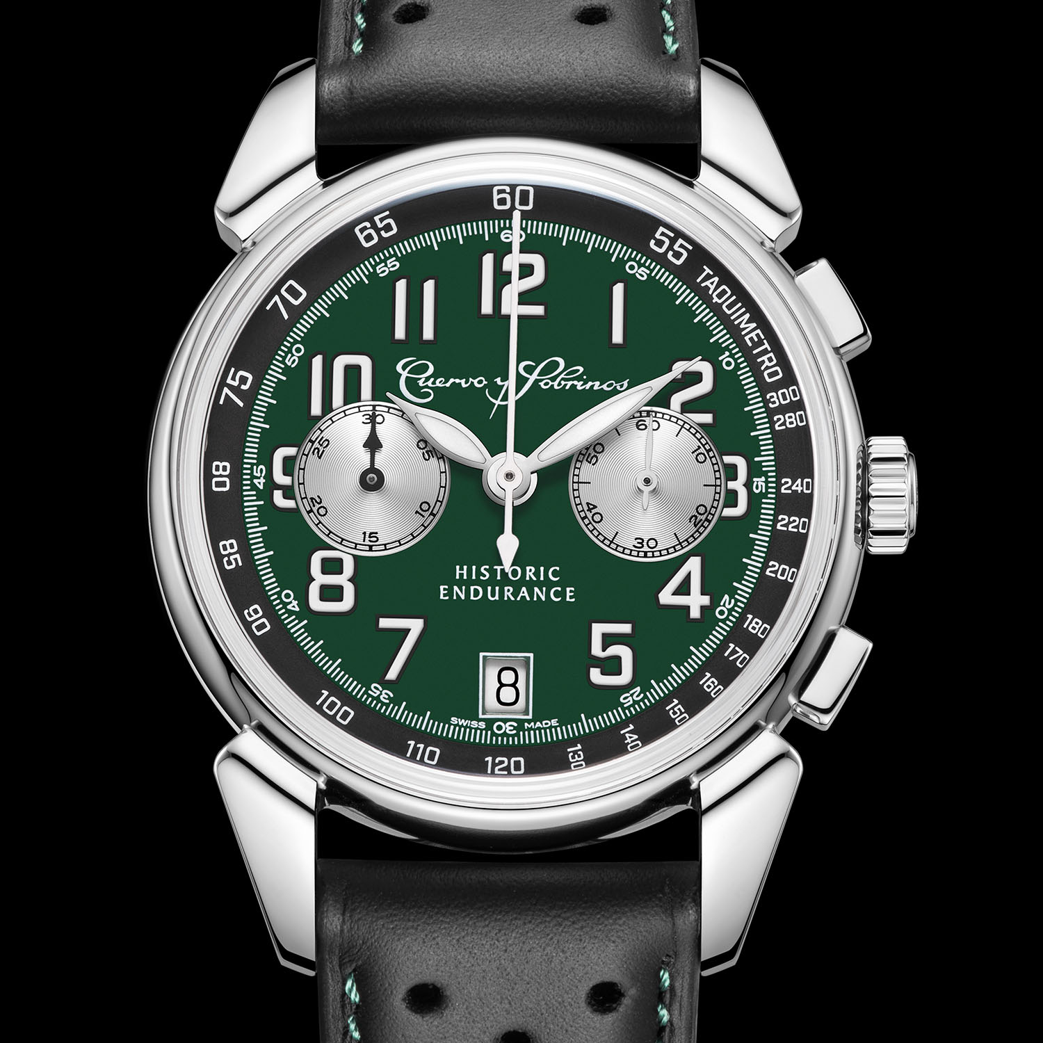 As the only Swiss brand with Latin roots, it makes perfect marketing sense for Cuervo y Sobrinos to support the Iberian Historic Endurance. In this race, pre-1976 racing cars compete in different categories in circuits located primarily in Spain and Portugal. To celebrate the alliance, Cuervo y Sobrinos presents a sporty chronograph, the Historiador Historic Endurance, with a classic British Racing Green dial and silver-toned counters designed to capture the more relaxed mood of the “Gentlemen Driver Spirit” category where crossing the finish line is not the primary goal.