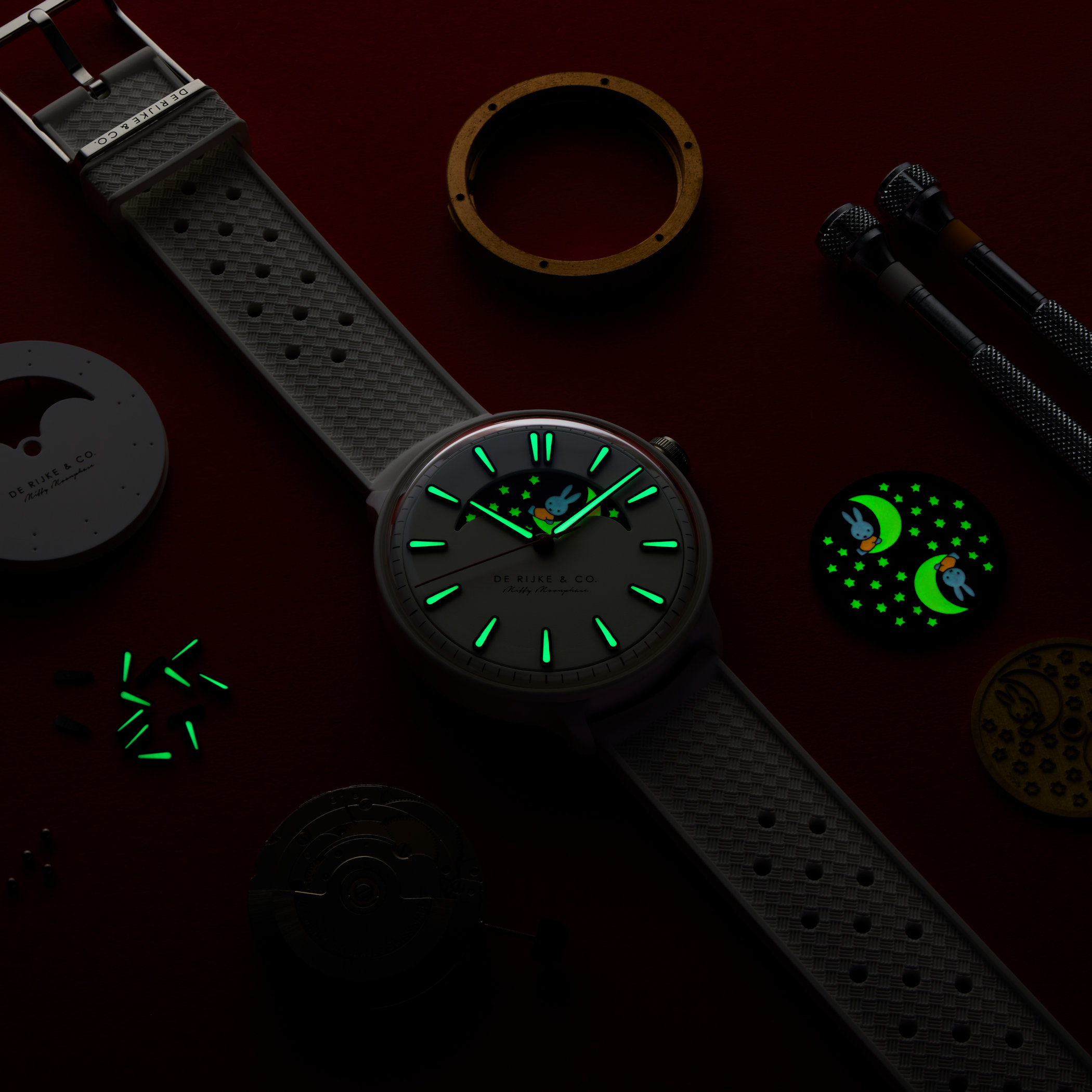 The swansong for De Rijke & Co’s whimsical and highly successful Miffy Moonphase collection is limited to 100 pieces in total. With it, you get a white FKM rubber strap with a pin buckle and a red elastic ‘Paratrooper’ strap. The watch retails for EUR 3,950 excl. VAT and will go on sale at 4 pm this afternoon! Be quick, though, as previous editions have sold out very fast!