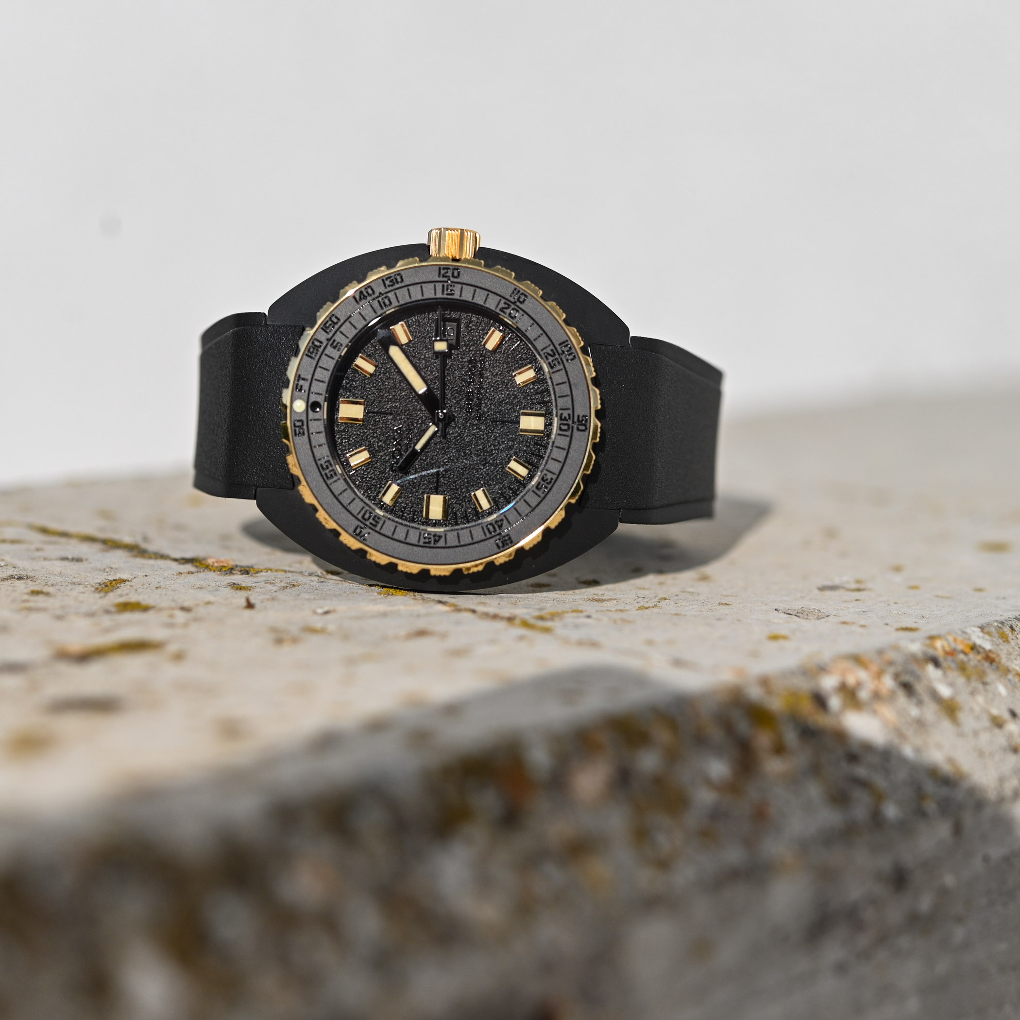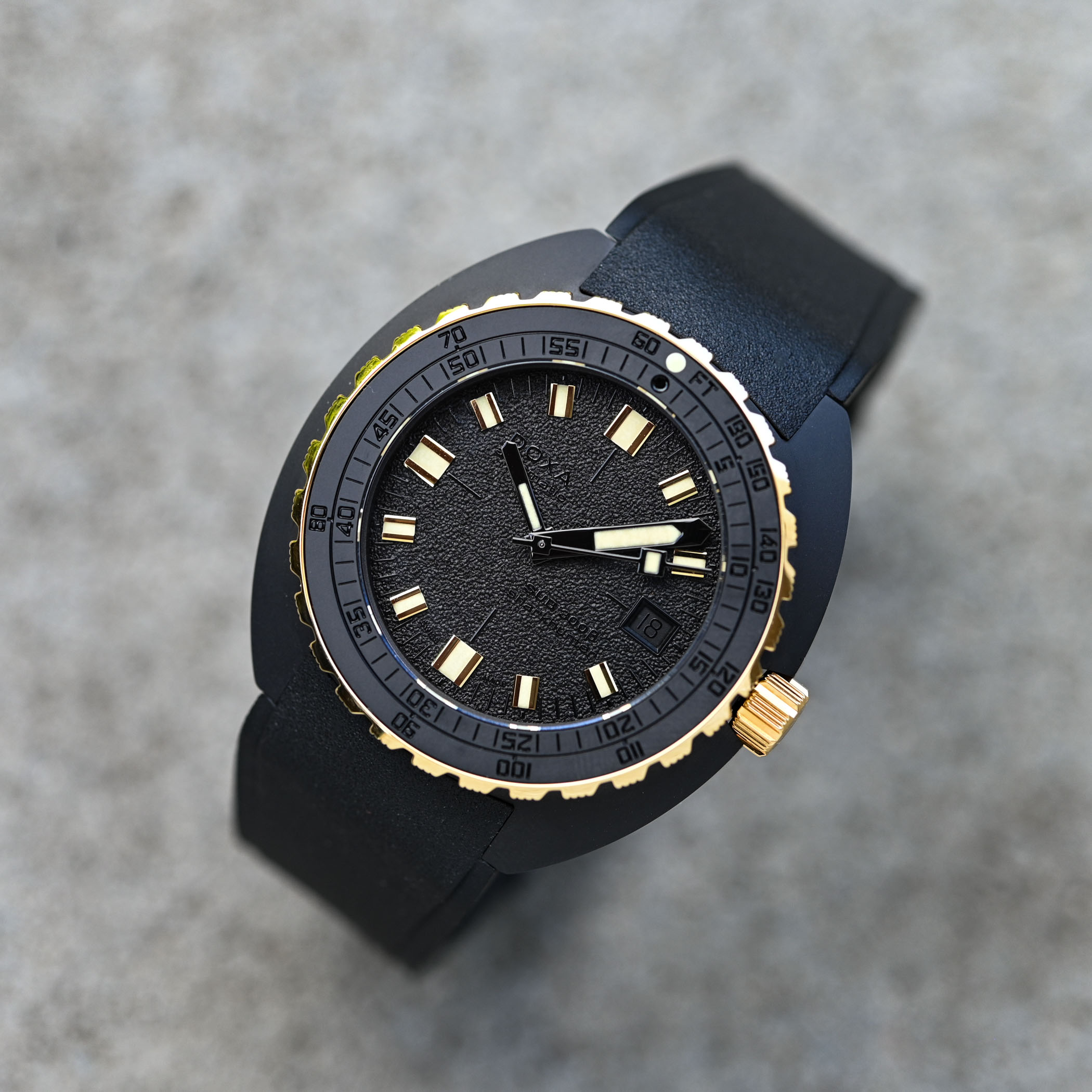 The black and gold theme continues on the inside too, as the matte black dial is finished with a coarsely-grained texture. The only contrasting bit of colour comes from the applied 18k gold-plated indices and the beige Super-LumiNova on the hour markers and hands. The minute track, as well as the logo, name, crosshair lines and outline for the date window are finished gloss black. The contrast is striking, to say the least, and the somewhat ghosted dial is certainly a departure from the well-known style by Doxa. Even the date disc underneath the dial is matte black with gloss black digits, complementing the stealthy look of the dial and case.