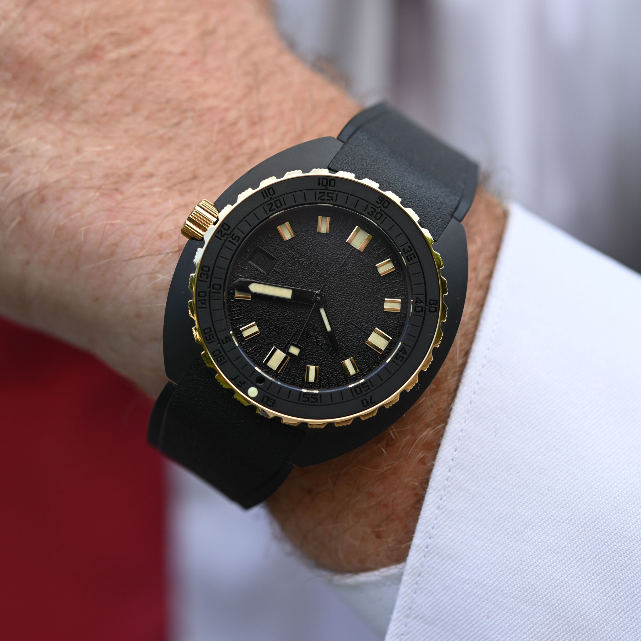 The exterior of the SUB 300 Beta Sharkhunter comes in matte black ceramic, similar to the limited edition Doxa Army made for Watches of Switzerland last year. It measures 42.50mm in width and 44.50mm in length, with a height of 11.95mm. The highly scratch-resistant case is topped with an 18k 3N gold unidirectional rotating bezel and crown, resulting in a colour scheme that evokes a distinct John Player’s Special vibe. The insert, with its signature double scale for depth in feet (outer ring) and time in minutes (inner ring), is also done in full matte black. Doxa was the first by the way, to use such a bezel on a diving watch, back in 1967 and the style, along with the helmet shape of the case is still at the core of the brand.