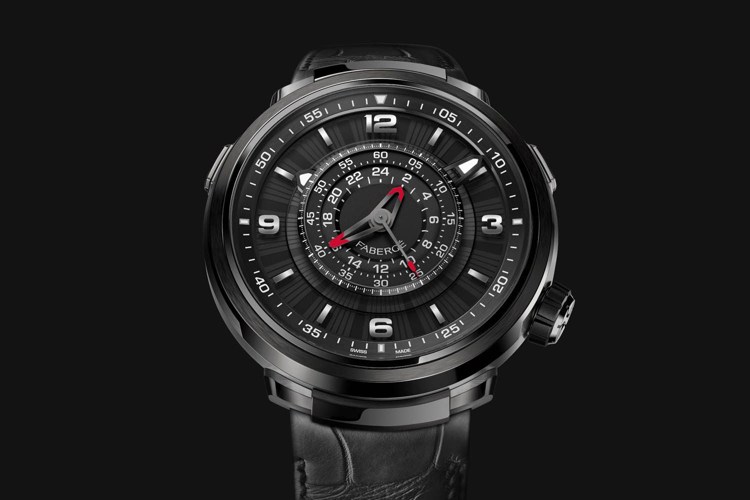 The dial of the Fabergé Visionnaire Chronograph features two distinct areas, each with its own distinct function. The time is indicated on the periphery, surrounding the chronograph indications that are displayed in the center. The hour and minute hands are not affixed on a central axis but rotating on a peripheral axle. The space in the centre is used by the chronograph indication, which are very easy to read, from the inside out: a 24-hour hand, a 60-minute hand and a second hand.