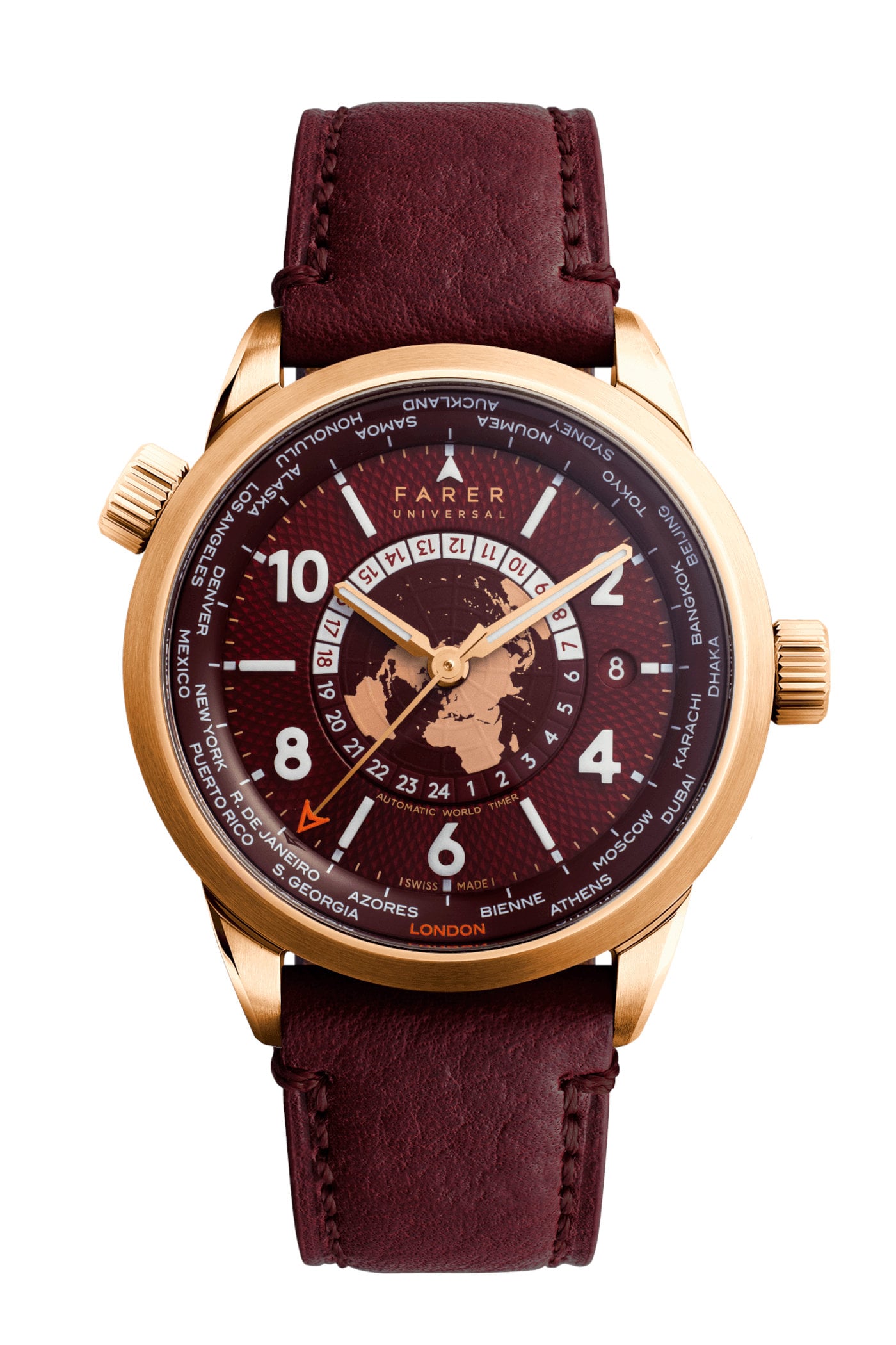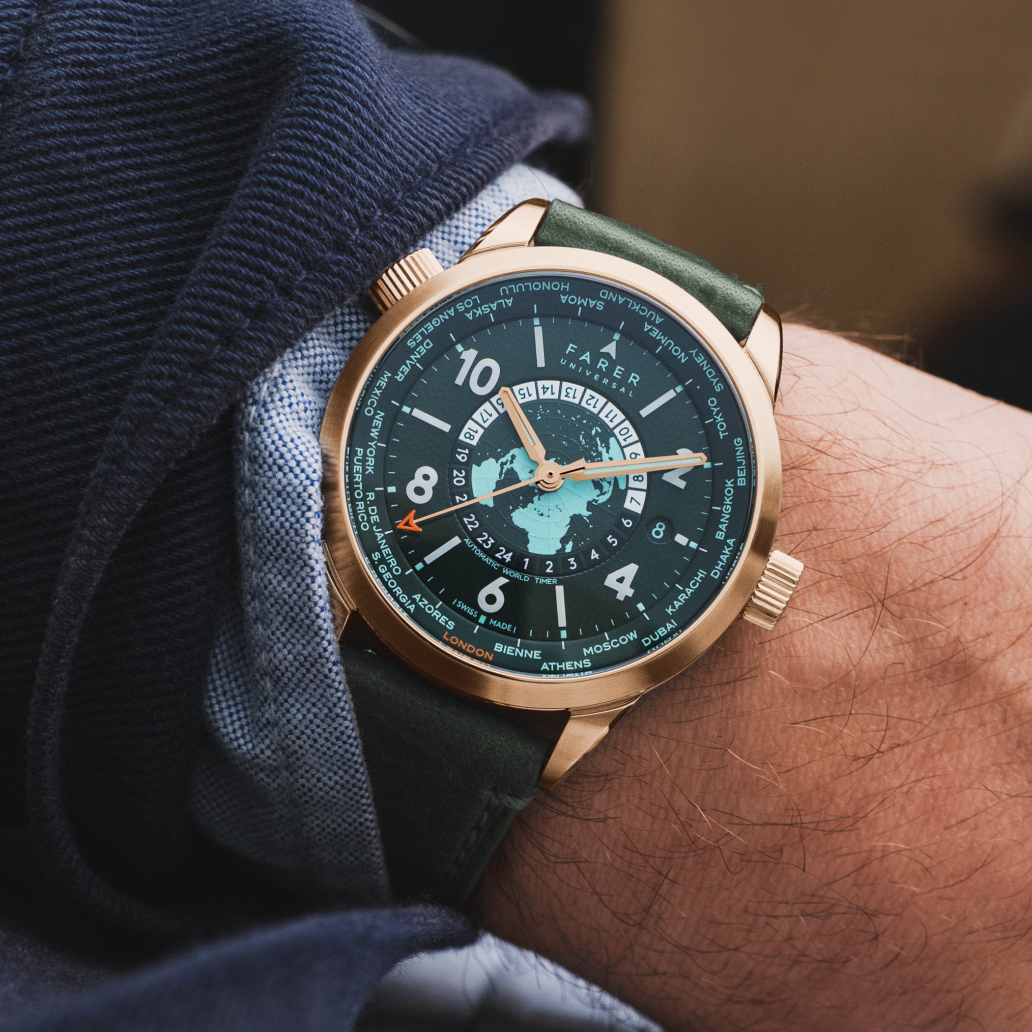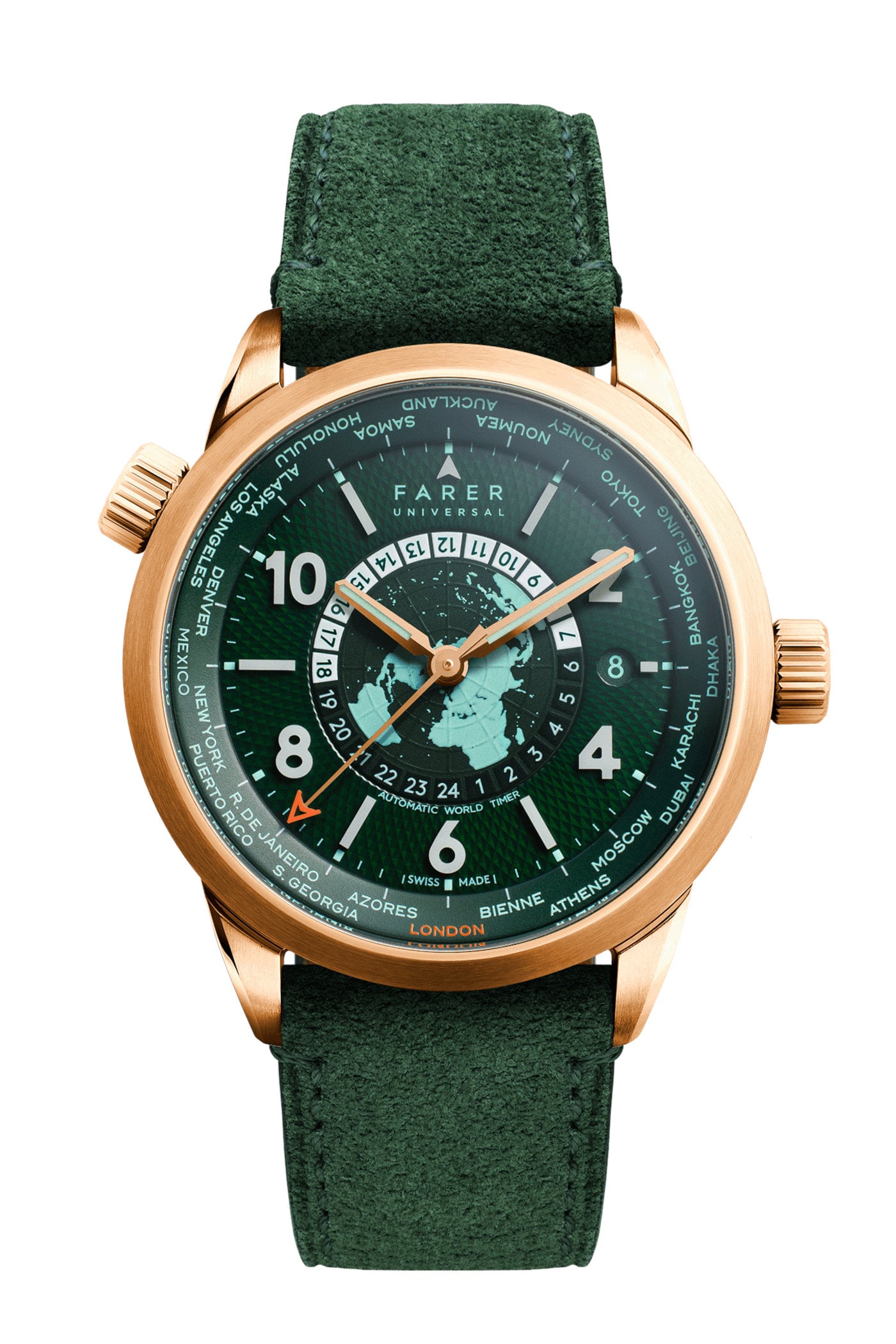 The white Arabic numerals and indices are made from Lumicast, solid blocks of ceramic blended with Super-LumiNova, and the 24-hour disc features white blocks for daytime hours and green or burgundy-coloured blocks for the night. A small round aperture cut into the guilloché chapter ring reveals the colour-matched date, and the centre of the dial features raised longitude and latitude lines, with the Northern Hemisphere depicted in a contrasting colour. Other design details, like the bright orange lacquered tip of the seconds hand (a Farer ‘A’), matching the colour of London printed on the bezel and the mint-coloured SLN inserted in the hour and minute hands of the Foxe model, matching the cities and date, attest to the attentive design of these models.