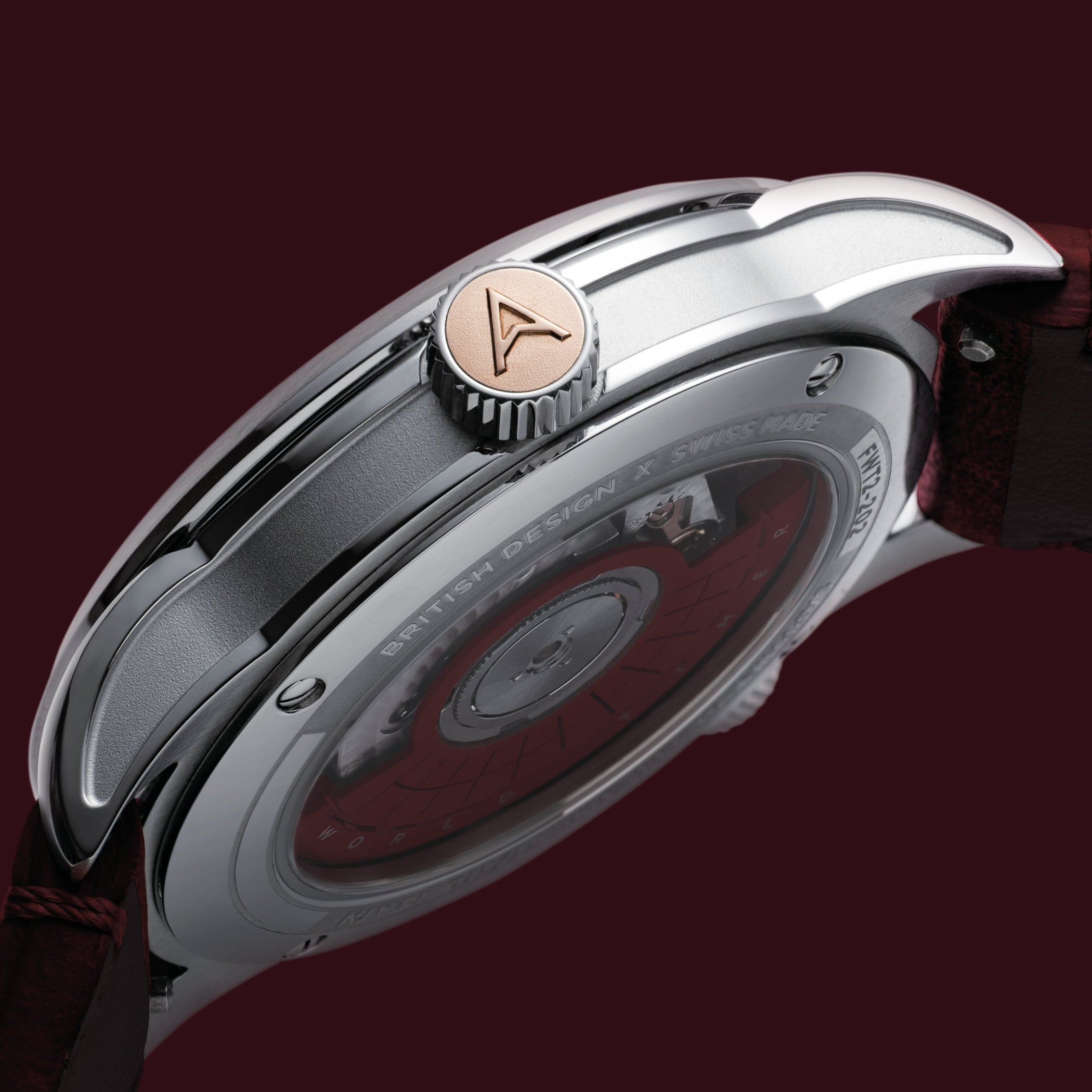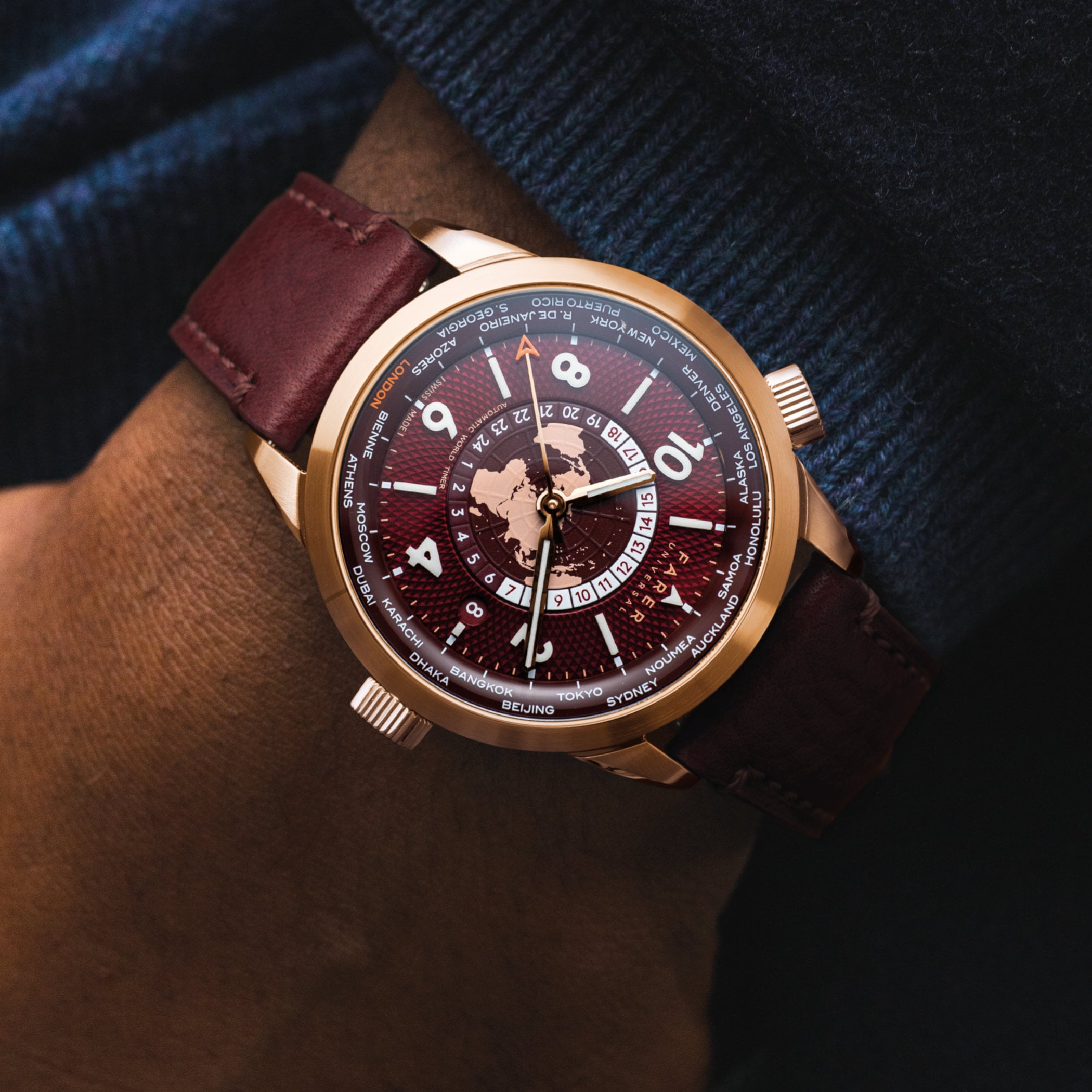 While the dark green Foxe dial already exists, it returns today with a gold PVD case, and the new burgundy-coloured Thorne dial is available with a steel case or a more luxurious gold PVD option. The concave dials of the World Timer reveal a host of details, the result of 40 different manufacturing processes (industry standards typically limit this to around 14). For starters, the wide chapter ring is decorated with a guilloché pattern, polished, and coated with clear lacquer.