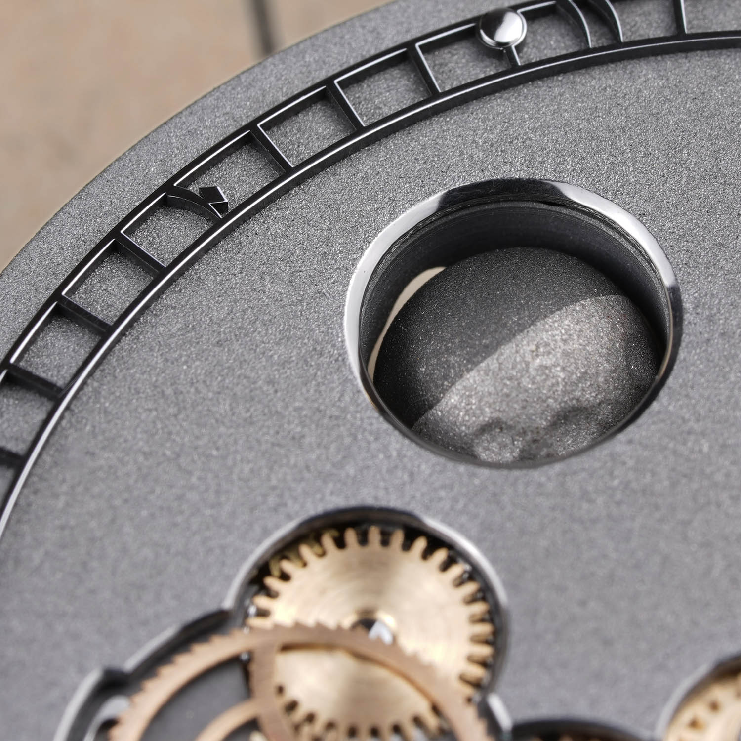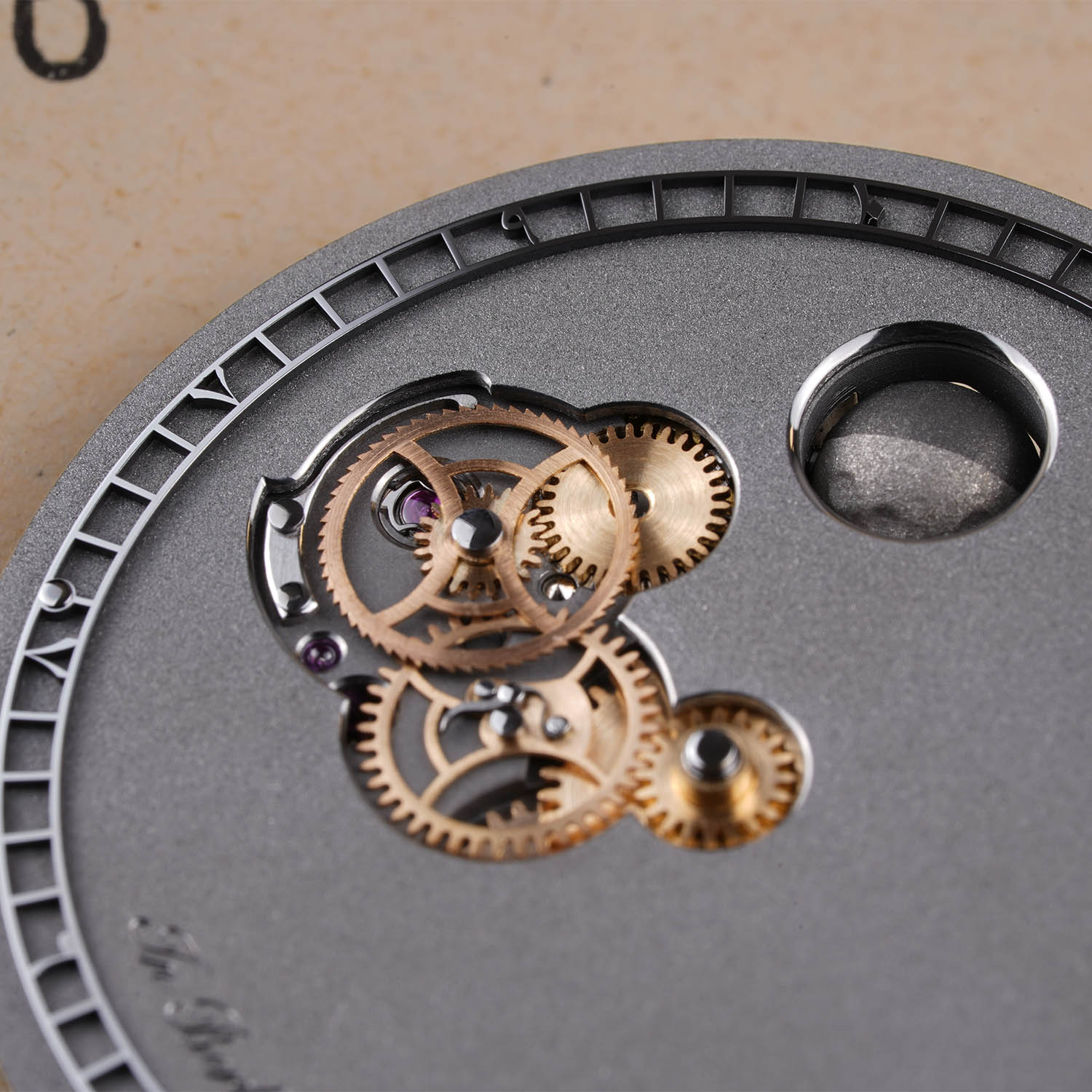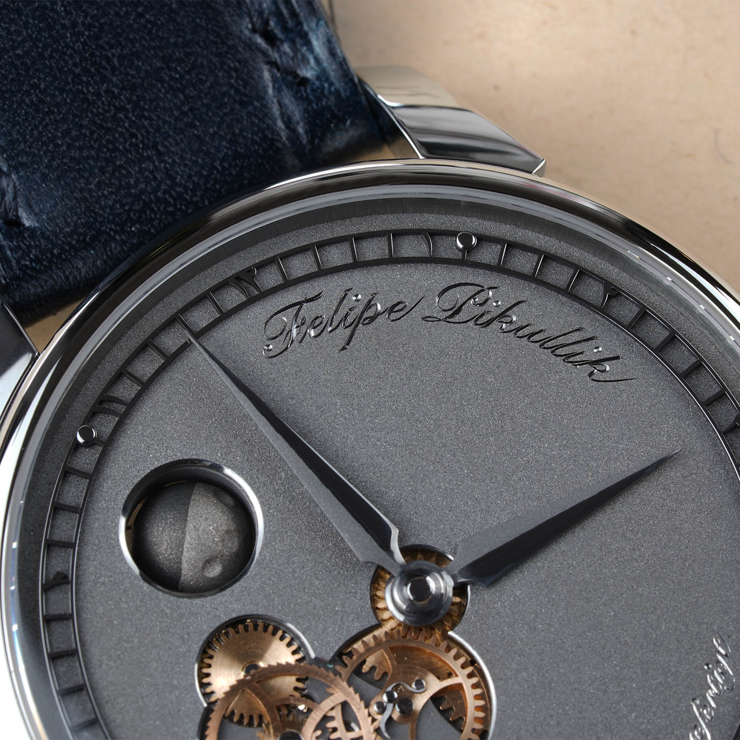 For the dial, Felipe started with a brass base which has been frosted and rhodium plated. Surrounding the dial is a black-polished chapter ring. The hands are crafted by hand and have a polished and frosted side. The dial also reveals part of the running gear, but the real talking piece is, of course, the 3D spherical moon phase that pokes through. It has a frosted finish with a dark and light side and some dimples to give it a bit more life. The finishing touches are the hand-engraved inscriptions ‘Felipe Pikullik’ and ‘Gefertigt in Berlin’ (Crafted in Berlin).