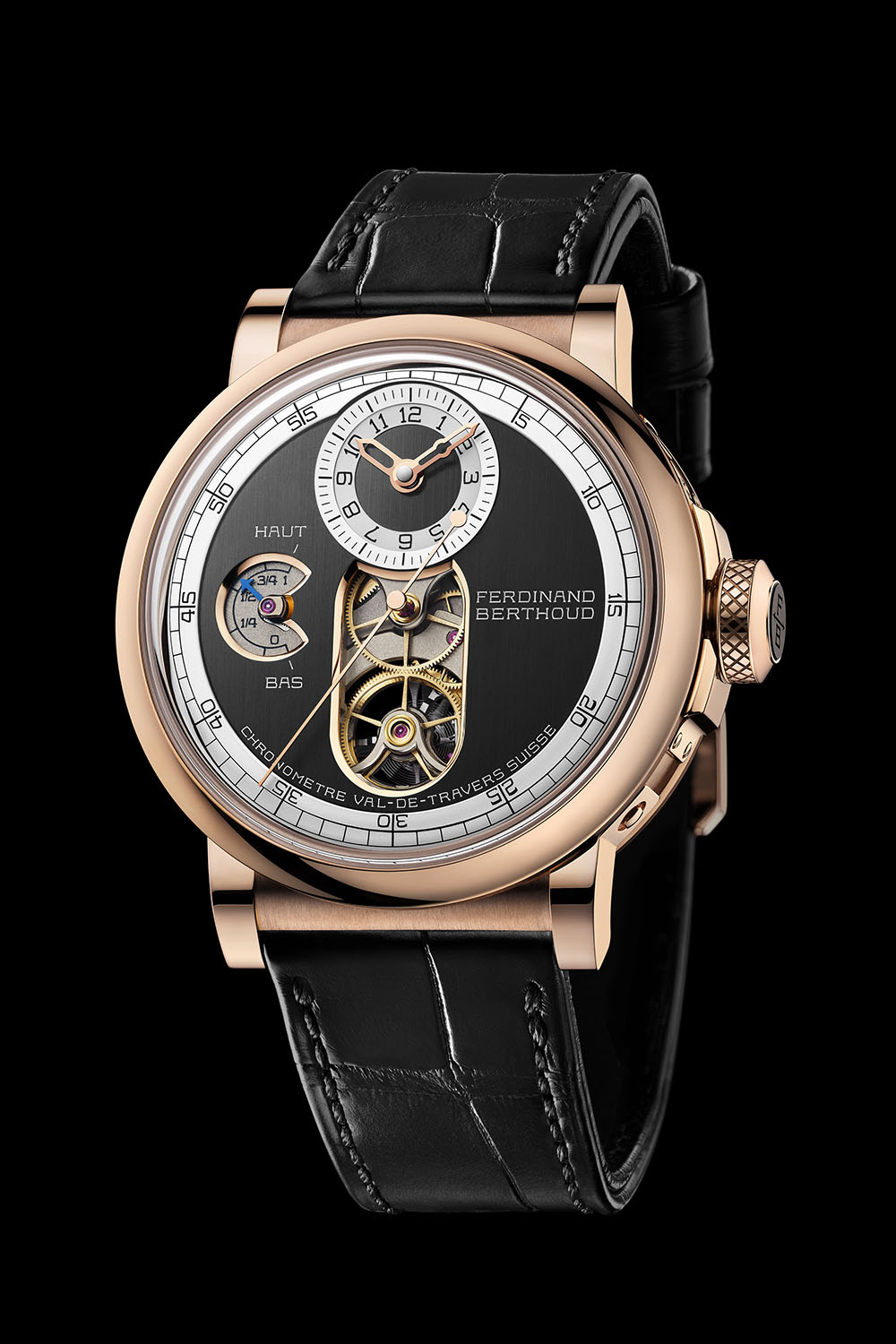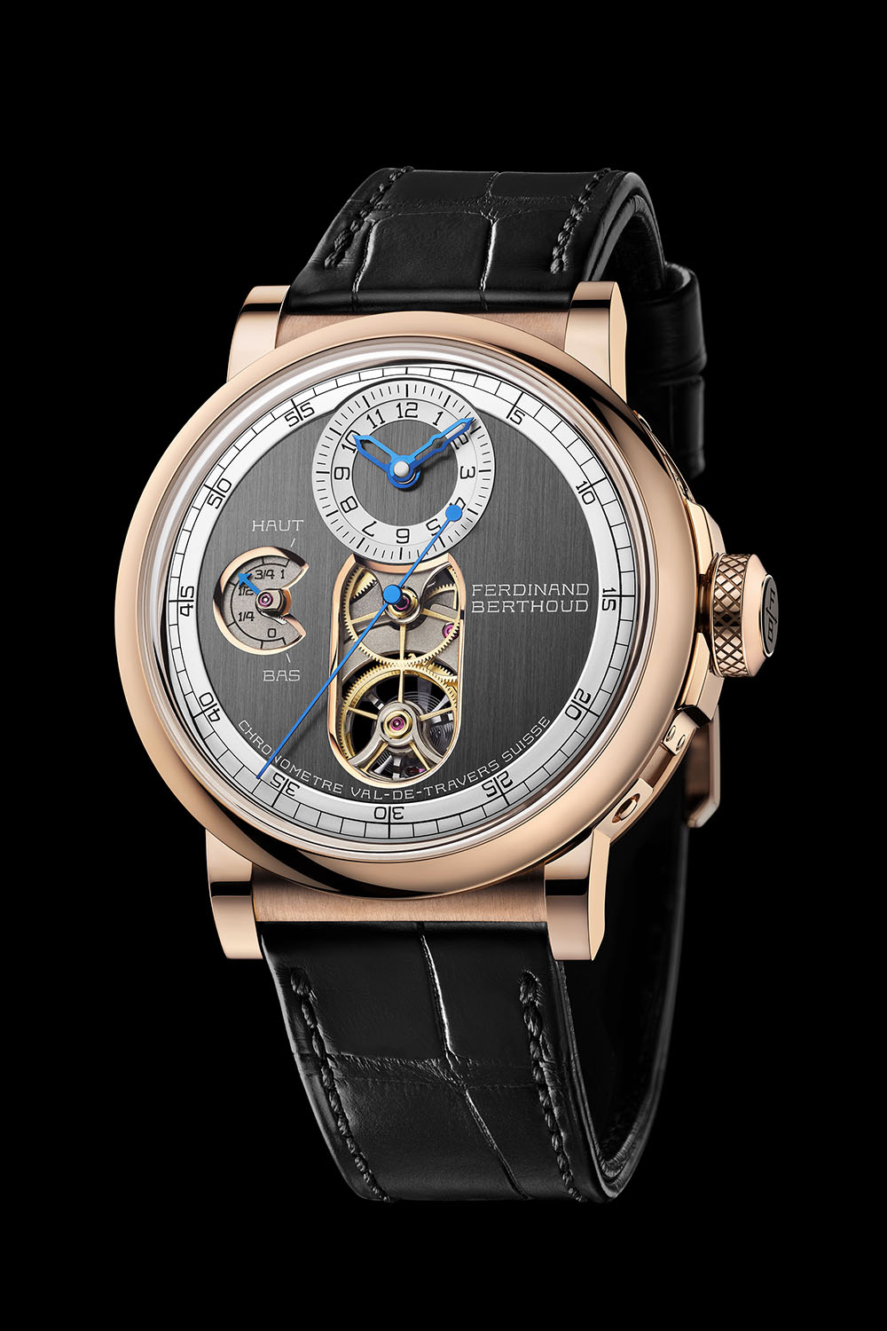 44mm in diameter, the shape and design of this final series vary greatly compared to most previous models, which were characterized by their bold and rather unique octagonal case. The Chronomètre FB 2T is round, and it somehow feels slightly more present on the wrist than the faceted case. What remains is the use of a lateral porthole in sapphire, offering a view of the mechanics inside. The final series, as said, is limited to 38 movements, with a choice of 3 different styles for the case/dial combination. It is available either in 18k white or 18k pink gold. All are made entirely of this material – no contrasting ceramic elements here – and worn on an alligator leather strap closed by a length-adjustable twin-blade folding clasp.