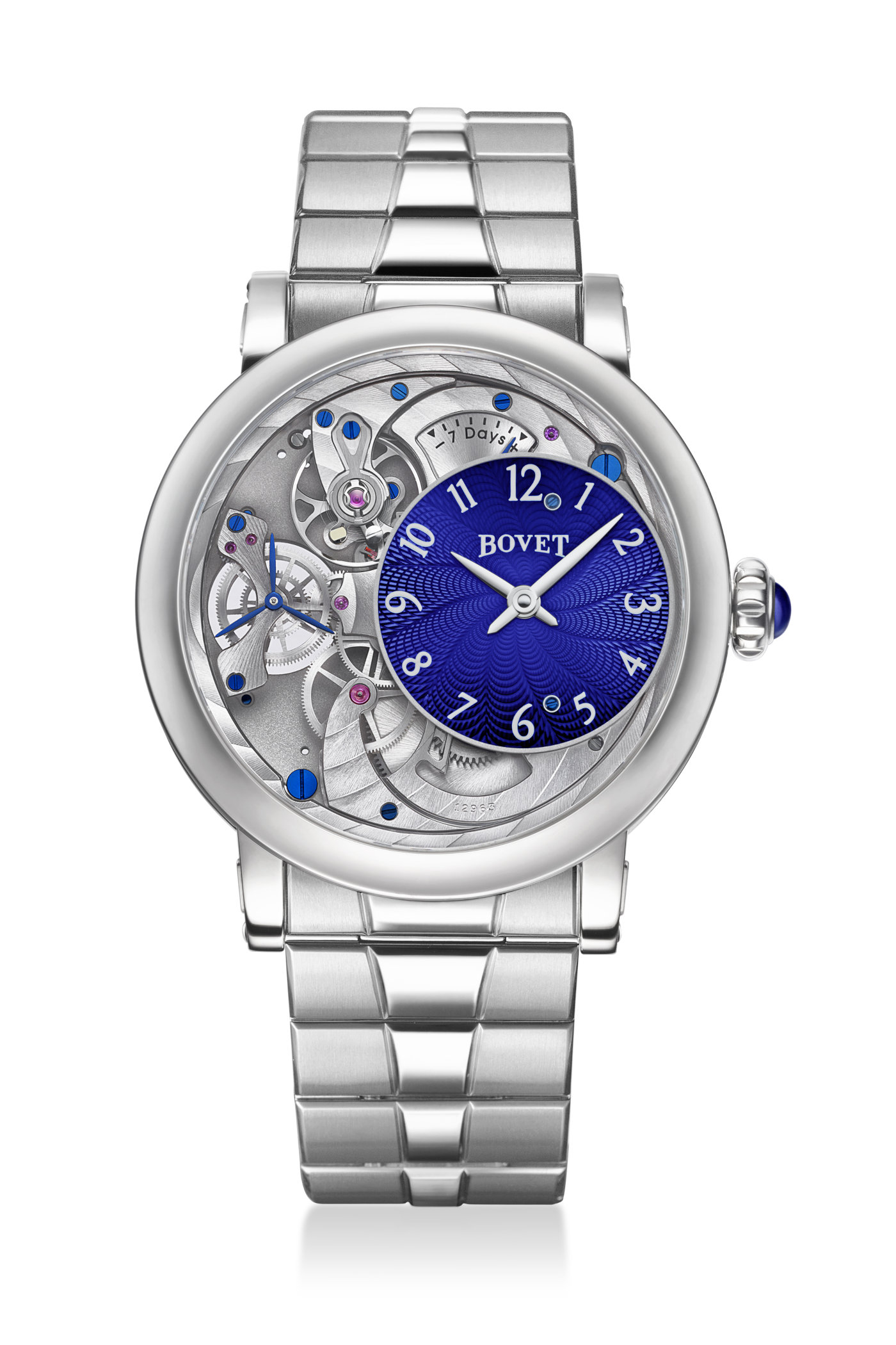 In true Bovet fashion, the bracelet stands out with its distinctive style and meticulous craftsmanship. Featuring brushed and polished surfaces, the design of the full titanium bracelet highlights a signature V of Bovet design. For his first bracelet watch, Pascal Raffy chose grade 5 titanium, known for its robustness, excellent resistance to corrosion and scratches, hypoallergenic properties, and supreme comfort due to its lightness. The bracelet is fitted with a folding buckle and a 3mm fine-adjustment system, allowing for micro-adjustments to the length for optimal comfort.