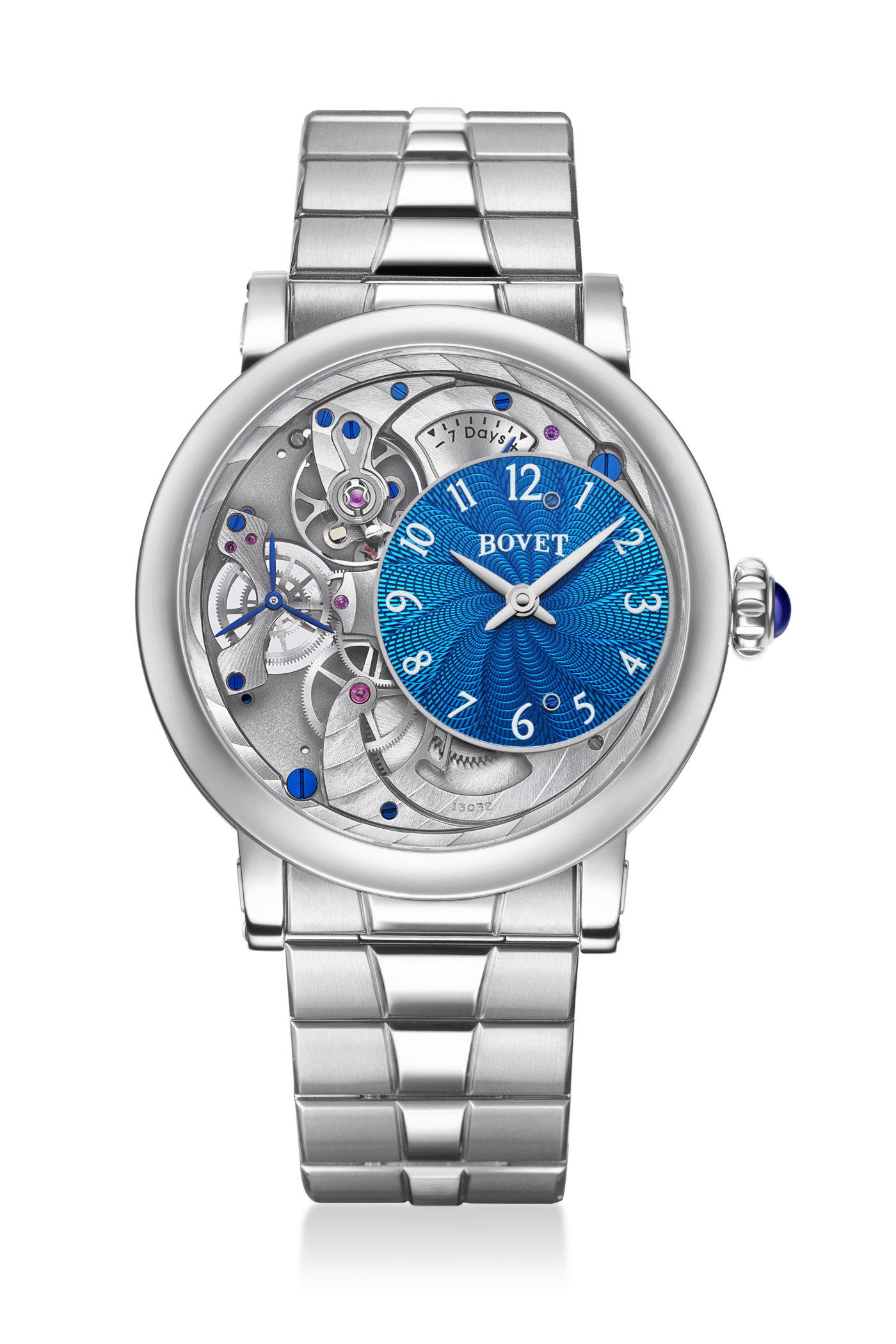 The architecture emphasizes symmetry, with the hours and minutes displayed at 3 o’clock and a three-pronged small-second indicator positioned at 9 o’clock. Additionally, there is a power reserve indicator to monitor the impressive 7-day autonomy. As expected from Bovet, the finishes are superb, featuring circular Geneva stripes and blued screws.