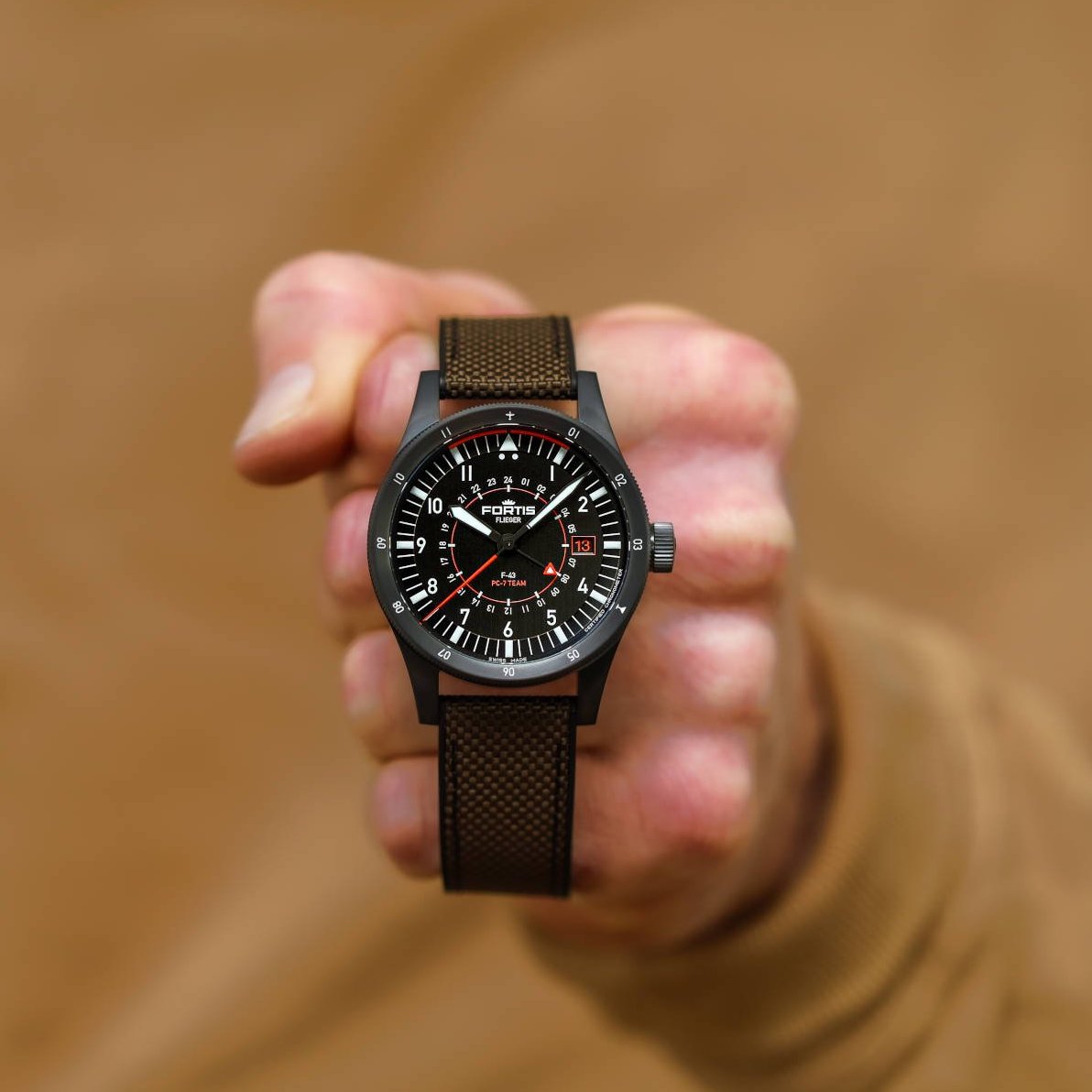The PC-7 Team is known as the group of highly trained pilots of the Swiss Air Force performing aerobatics displays. Introduced in 1982, it has since its establishment flown the Pilatus PC-7 Turbo Trainer, which explains the name of the team. And, unsurprisingly, these rapid, ultra-manoeuvrable planes come with a red and white livery. Like all good pilots, the members of the PC-7 Team somehow need a dedicated watch, a backup instrument to be worn on the wrist. Their choice went again for Fortis (it isn’t the first time the two are teaming up) and their ultra-focused Flieger collection, specifically the higher-end, traveller’s oriented model, the F-43 Triple-GMT.