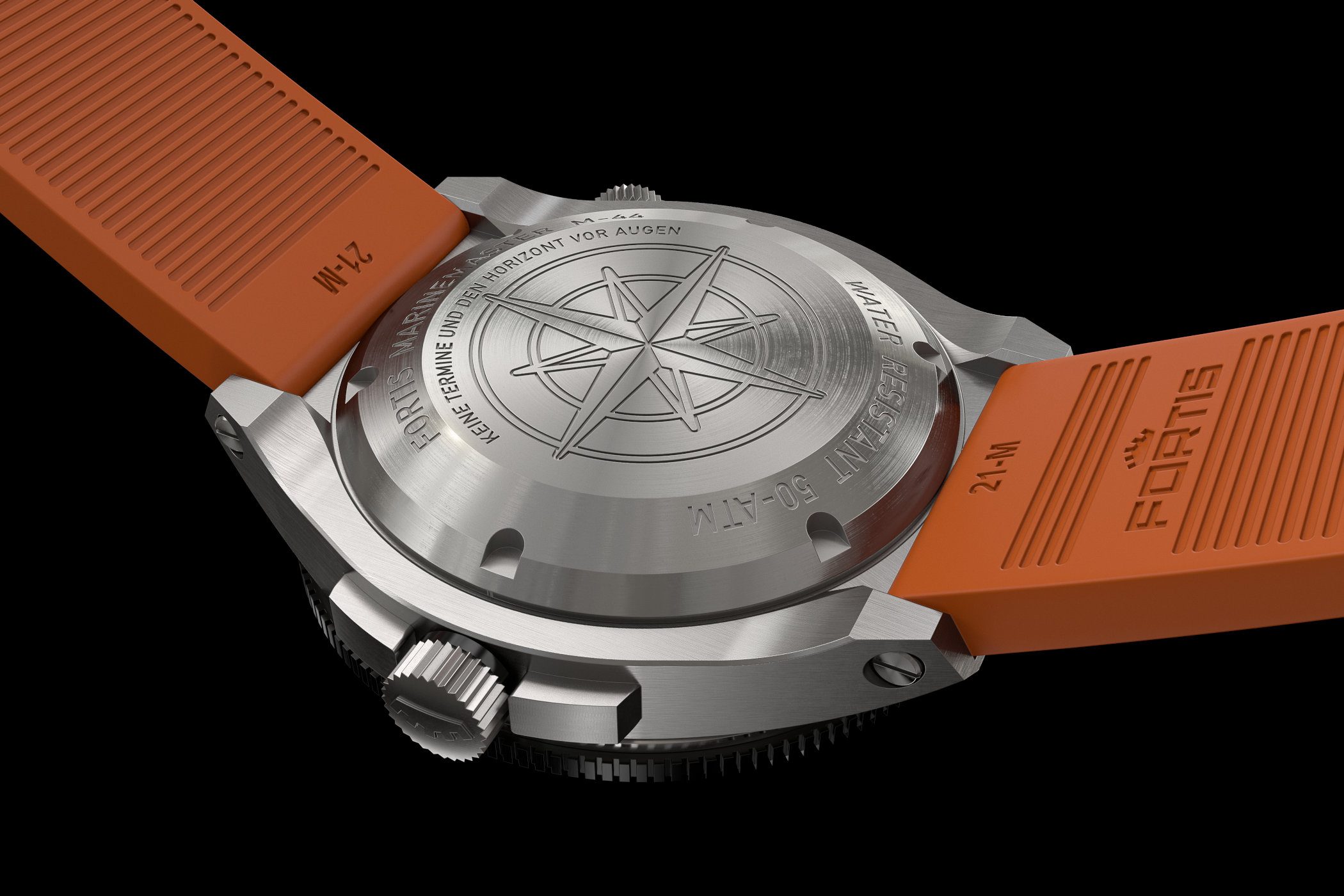Fortis has decided to fit the Marinemaster M-44 with a manufacture movement made with Kenissi (Tudor’s movement maker), just like it has done before with the Fortis Flieger F-43 Triple GMT, for instance. The M-44 uses the WERK 11 movement, with 26 jewels and running at a frequency of 28,800vph. It is a certified COSC Chronometer and provides a healthy 70-hour power reserve. Although it’s hidden from view by the solid caseback, it has a Fortis signed winding rotor.