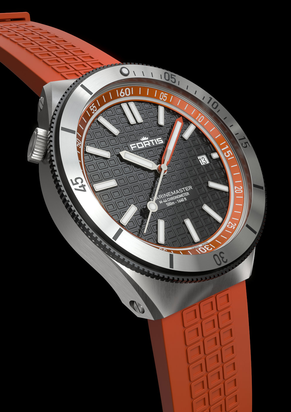 The Fortis Marinemaster M-44 comes on an Amber Orange rubber strap with an embossed Fortis-O pattern on top. As an alternative, Fortis also offers the M-44 with a stainless steel Block bracelet, similar to the M-40. This has a slide clasp for quick adjustments when worn on the wrist. The Fortis Marinemaster M-44 retails for EUR 4,050 on the rubber strap and EUR 4,400 on the bracelet.