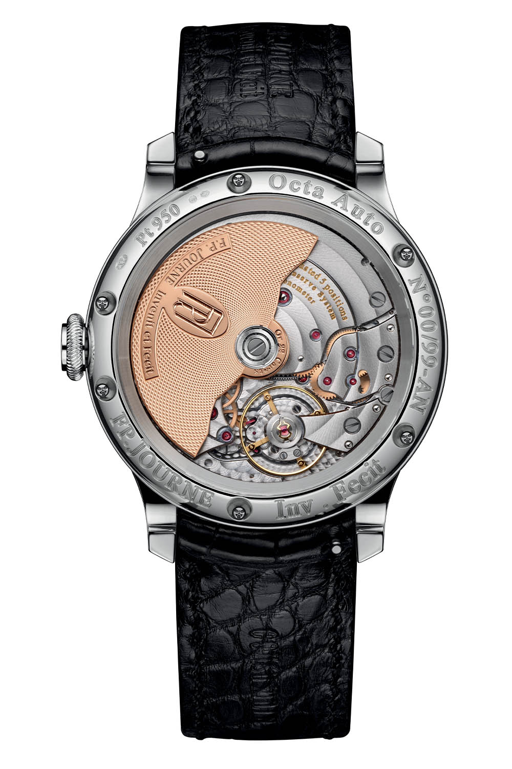 Turning the watch over and you’ll discover a reworked Octa calibre… And one that is not made with solid gold plates and bridges – as it is the case for all modern F.P. Journe movements – but that is using classic brass as a material, later rhodium-plated. And that is certainly a nice tribute to the first Octa watches. The movement, calibre 1300.3, is also bringing its lot of updates compared to the existing Octa calibre. If the base is the same, it is now decorated with openwork bridges. For the rest, it is the same powerful architecture with a 160-hour power reserve – which is limited to 120h for stability reasons. This 3Hz movement is finely equipped, with a unidirectional automatic winding in 22k gold, with guilloché finish and a free-sprung balance with four adjustable inertia weights. The decoration is typical Journe, with graining on the base plate, circular Côtes de Genève, golden engravings, polished screw heads with chamfered slots, hand-polished steel components and chamfered edges on the bridges.