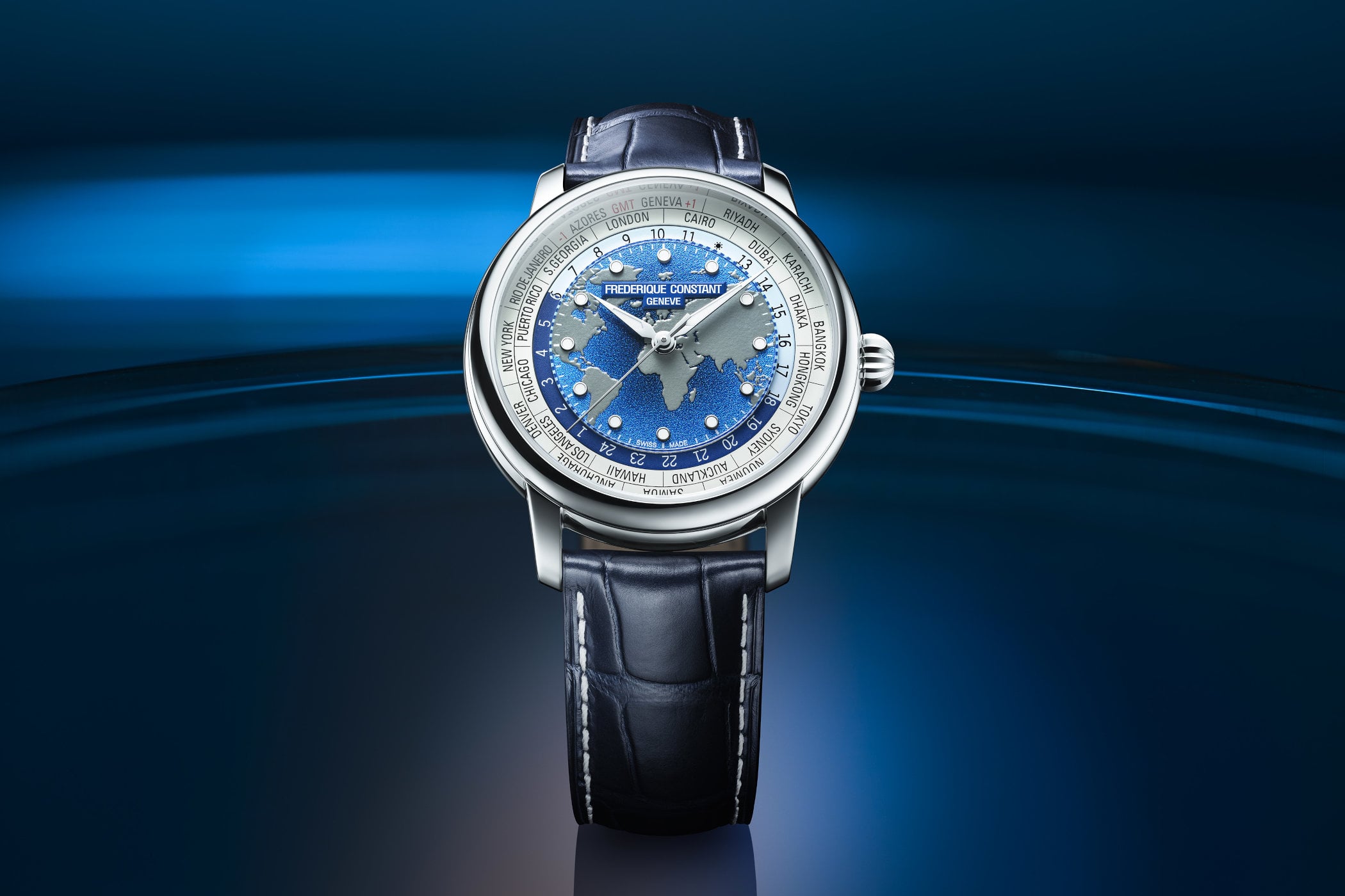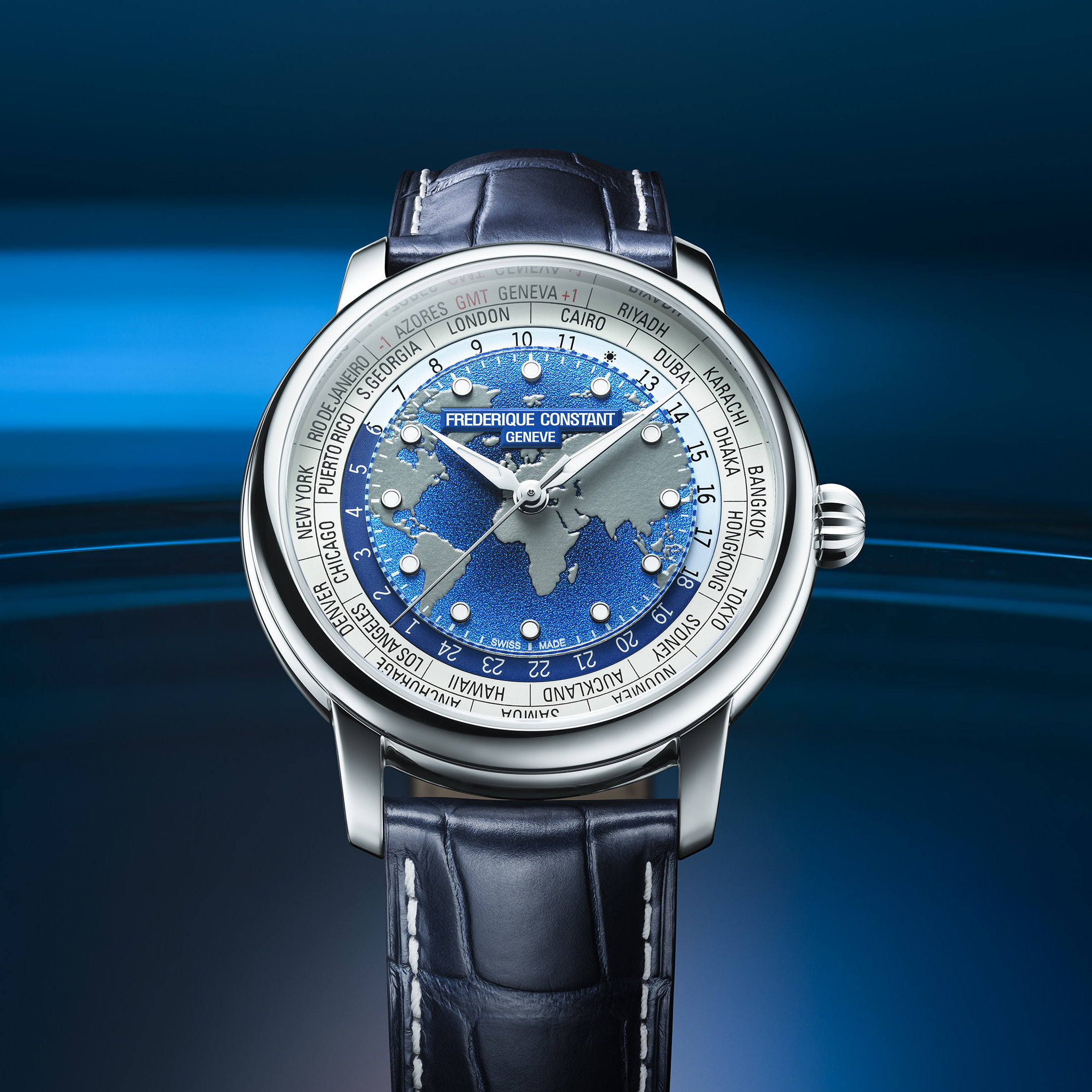 Frederique Constant has also simplified the dial. The date indication, often criticised for overlapping the city disc, has been removed, allowing the worldtime display to take centre stage, uninterrupted. As before, a relief world map shows continents rising above the oceans. Surrounding it is the familiar 24-hour disc with day/night indication, with the city ring displaying the names of the 24 reference time zones on the dial´s periphery.
